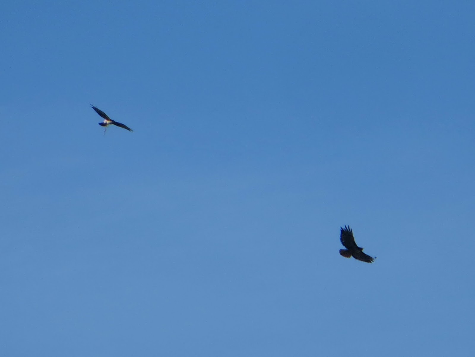 A Red-Tailed Hawk and a Northern Harrier were soaring very high up in the air (which is unusual for a harrier).  For a while they flew together peacefully, but then the harrier started to dive at the Red-Tailed Hawk whenever they came close to each other.  There was some long, stringy thing attached to the harriers claws that later fell off.  It can be seen in the photos below.  I'm not sure what it was.  Below are two photos; one of the Northern Harrier and one of the harrier and the Red-Tailed Hawk.