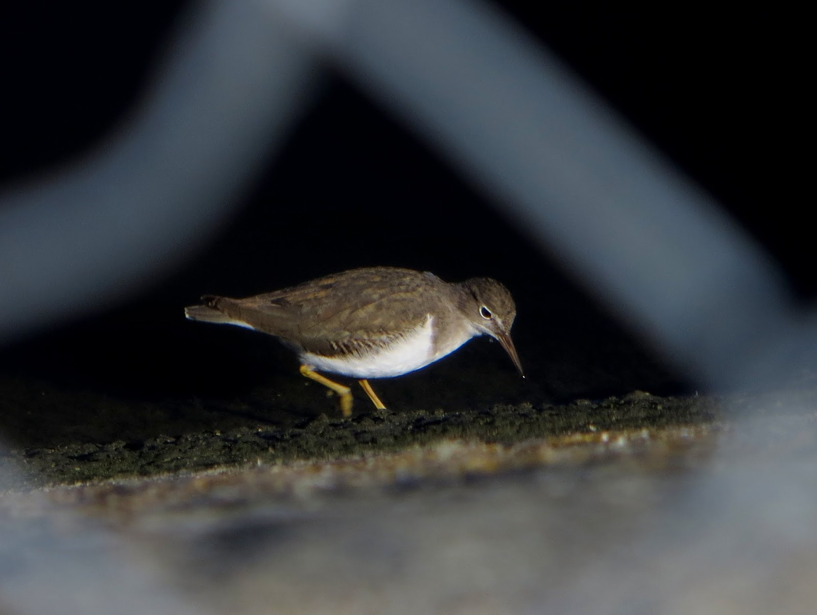 The Spotted Sandpiper was in its usual place under the bridge.  It flew back and forth once or twice along the edge of the water and ran around.  It didn't stay out in the open for very long, though, and I only managed to take one good photo of it through a fence.  Below is the Spotted Sandpiper.