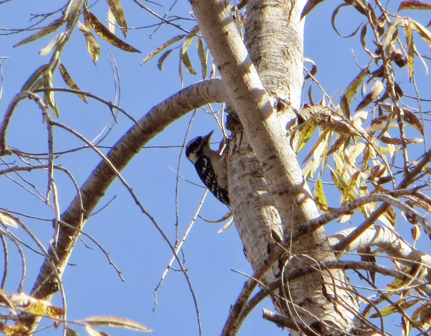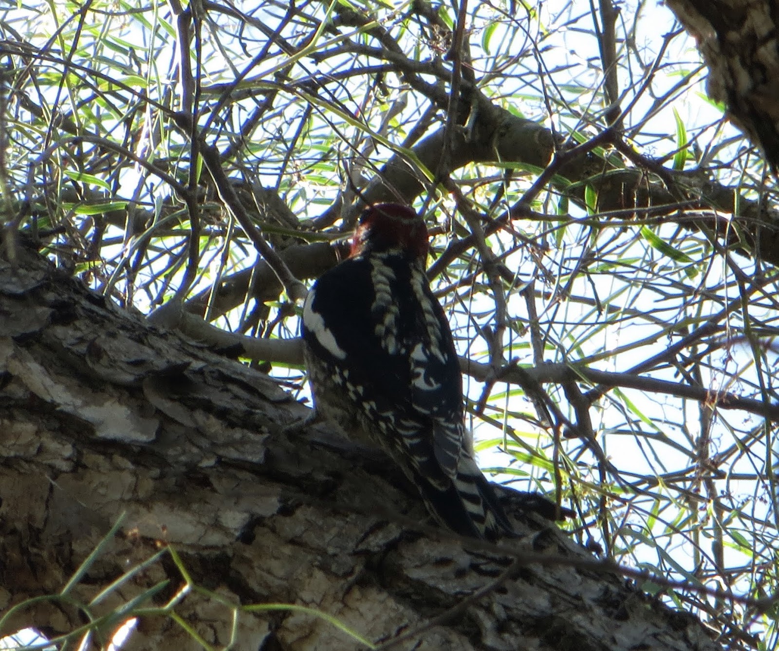 For some reason, we've suddenly started seeing northern flickers at the lagoon. Before now, we almost never saw flickers, but last month we saw one and today we saw three. Northern flickers are found in Alaska and Canada in the summer and Mexico in the winter. Throughout most of the United States, they are around all year. They have bluish-gray heads and light brown bodies. They have black spots on their bellies and black stripes on their backs. Under their wings is bright red. Males have a red malar (area on the face just below the cheek). One of the flickers I saw let me get fairly close to it before flying a short distance away. I was surprised at how large it was. They're about a foot long from beak to tail. They are also very loud. The one I saw was calling "kew" over and over. Below is a photo of it in a tree.
