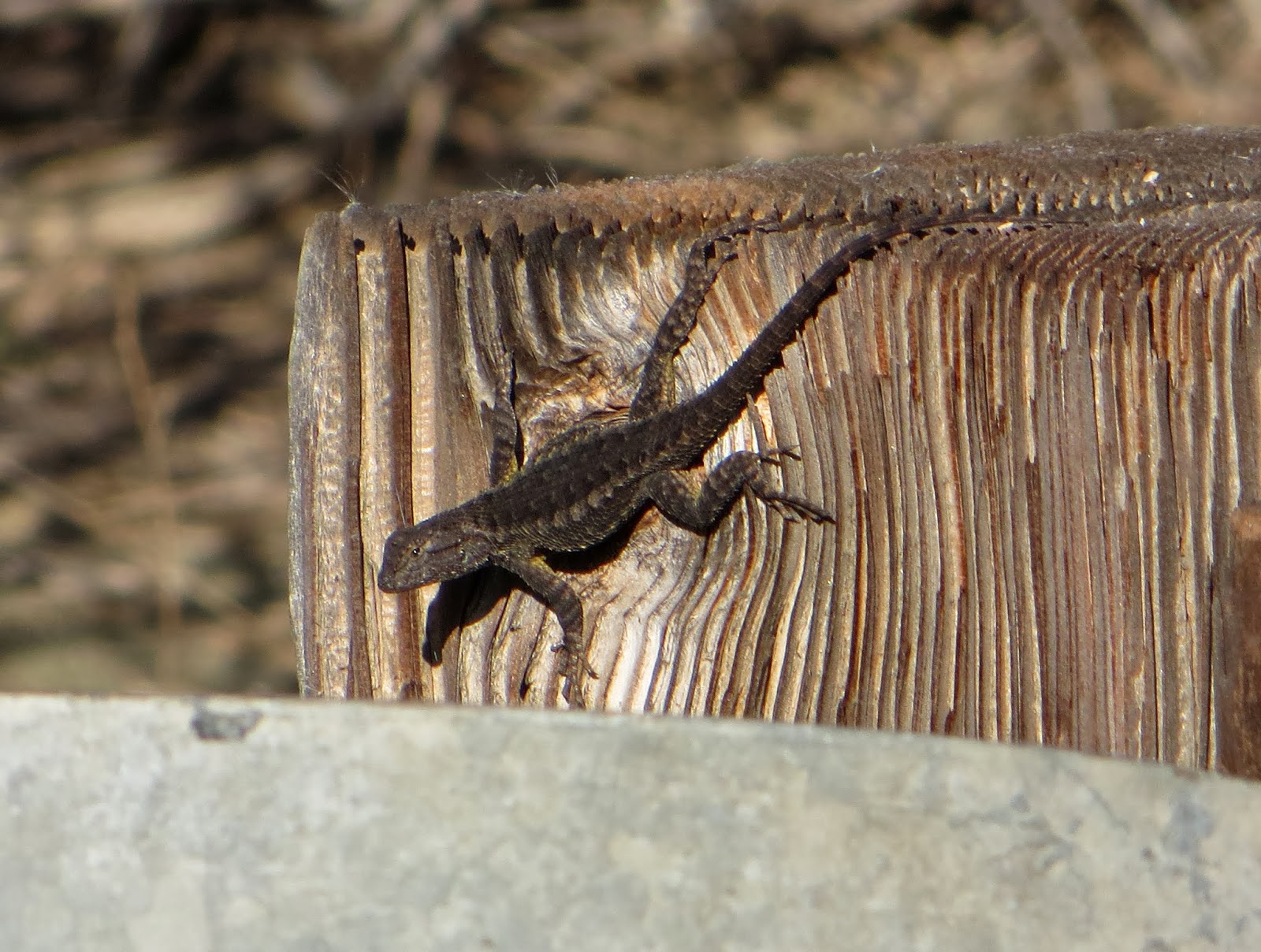 Since it was such a warm day, quite a few western fence lizards came out to bask in the sun. Below is photo of one of them. It was watching me very carefully, and dashed into a crack in the wood when I came to close.