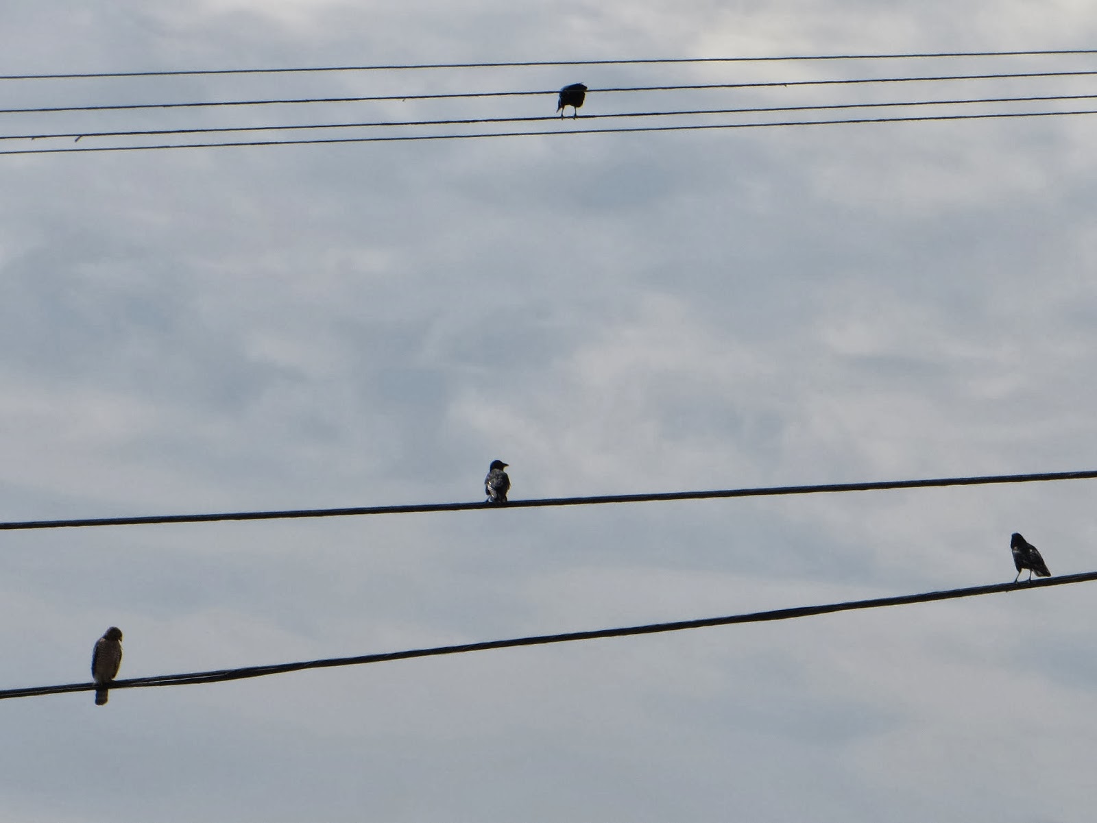 There were several hawks around. As we were leaving, there was a red-shouldered hawk sitting on a telephone wire eating something. There were four upset crows sitting around it. Below are two photos. The first is of the hawk, and the second is of the hawk and three of the four crows (the hawk is at the bottom left).