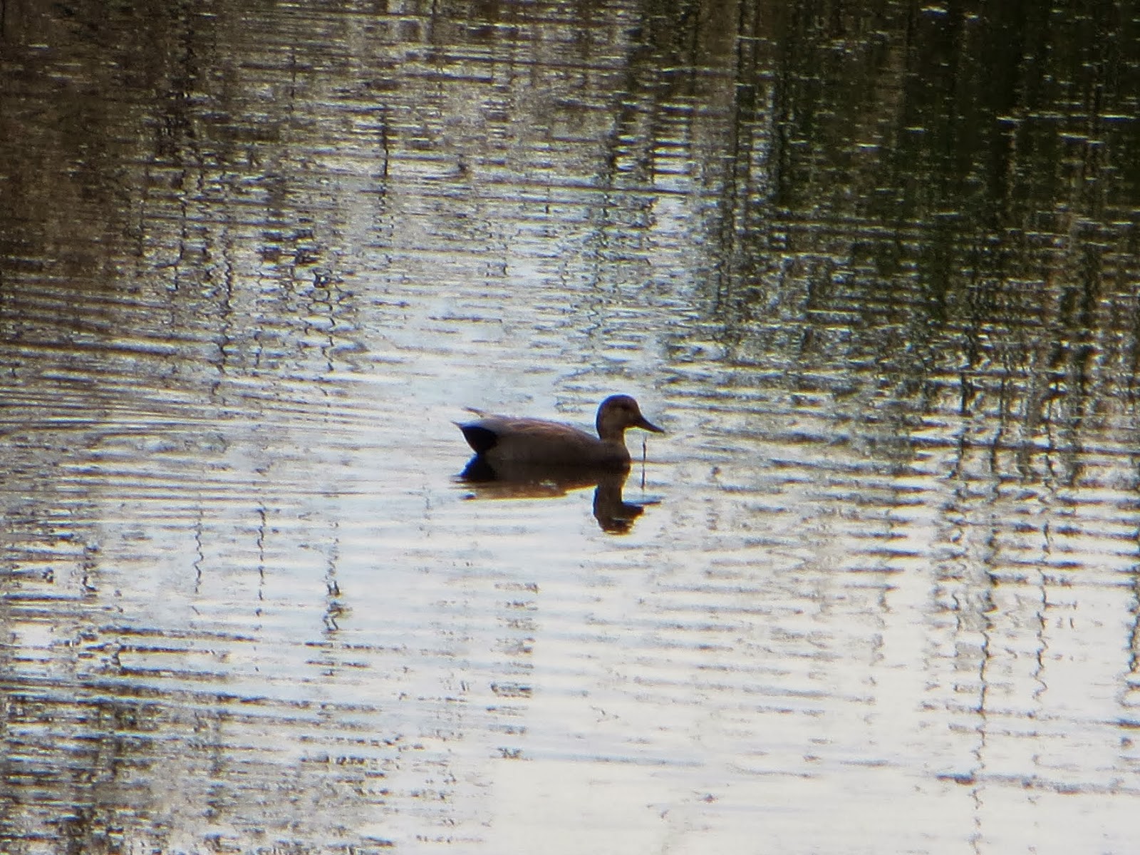 A duck I hadn't seen in a while was the gadwall. Yesterday, I saw a few. Gadwall are found in southern Canada and the central United States in the summer, and the southern United States and Mexico in the winter. Along the Pacific coast, they are around all year. Male gadwall are plain gray on their heads and sides, with white bellies, black rumps, and white underwings. They also have a tan patch on their wings. Females are similar to female mallards, but their have higher foreheads and mostly unmarked faces. Gadwall are a little bit smaller than mallards. Below is a male gadwall under a bridge.