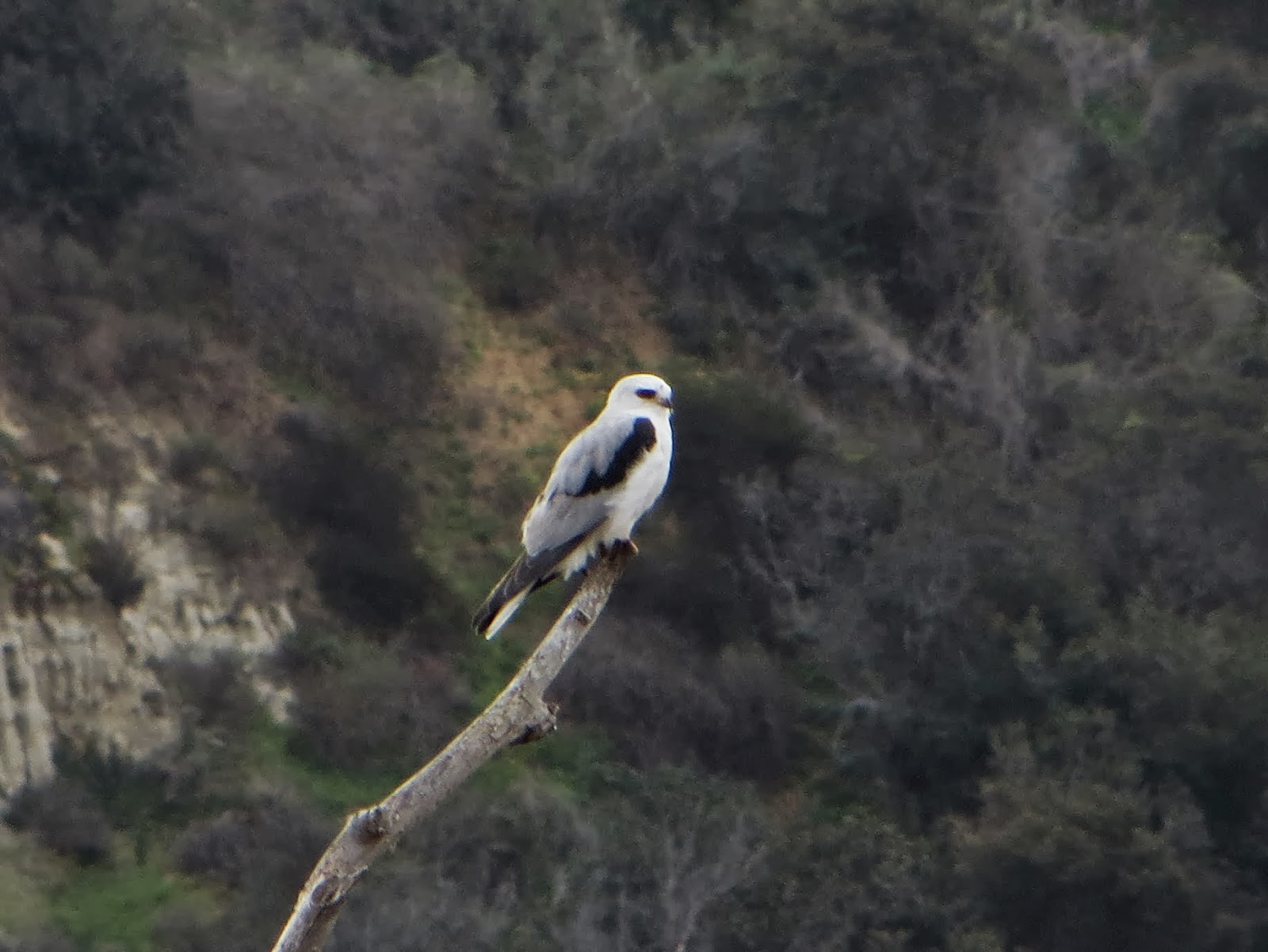 A rather exciting bird was a white-tailed kite. I hadn't seen one at the lagoon in quite a while. White-tailed kites are found along the Pacific coast, southern Texas and Florida, and down through Mexico and South America all year round. They can often be seen hovering over marshes and fields hunting for small mammals. Adults are pure white below with gray wings, black shoulders, and red eyes. Juveniles have light eyes and some brown on their chests and upper backs. The one we saw at the lagoon just flew straight in and sat on a branch above the reeds. Below is a photo of it.