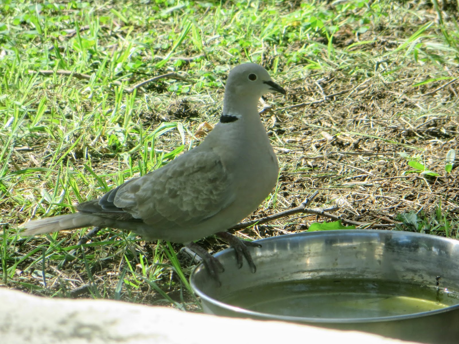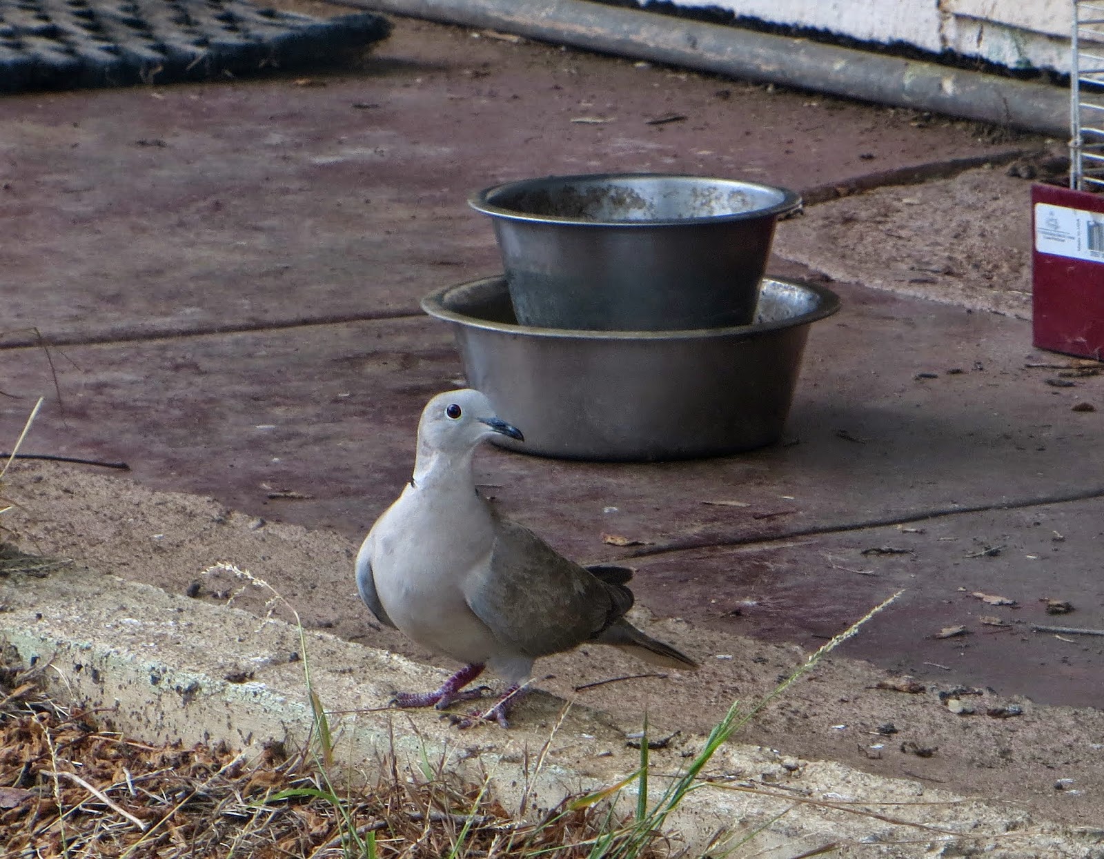 Another somewhat surprising visitor to the food bowls is a Eurasian collared-dove. I wouldn't have thought that doves would eat cat food, but I suppose they need their protein, too. Since the collared-dove it so big, it often has trouble balancing and tips the bowl over. Below are two photos. The first is of the dove near the cat food bowl and the second is of it at a water bowl (it almost fell of that bowl, too).