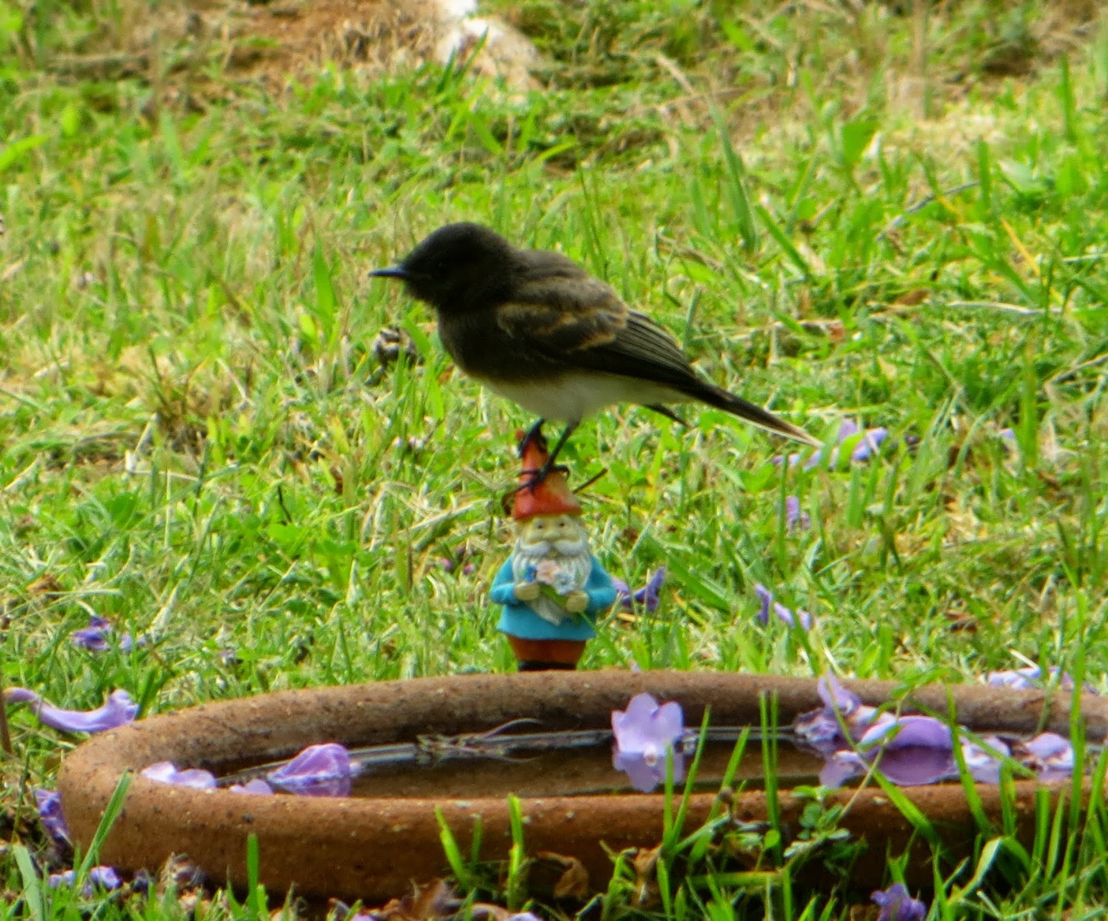 The young black phoebe from spring still hangs around our yard. For a long while, it wasn't able to catch any flying insects, so all it did was land on the ground and catch pill bugs. I think it can catch the other insects, but it still eats a large amount of pill bugs. Below are two photos of it.
