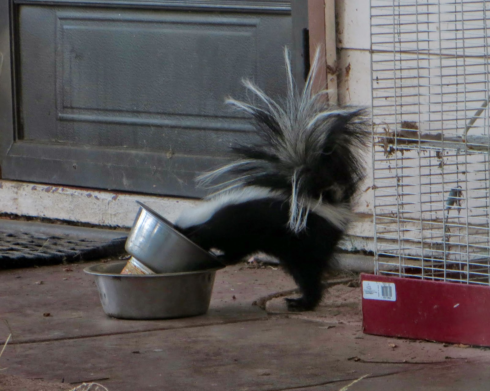 The striped skunks still visit the catfood bowls every day. The mother skunk doesn't visit very often, but the two young ones always come. We always know when they're around because they make a loud clatter with bowls when they eat. We think they might be living in a concrete tube in our yard. Below are three photos of the skunks.