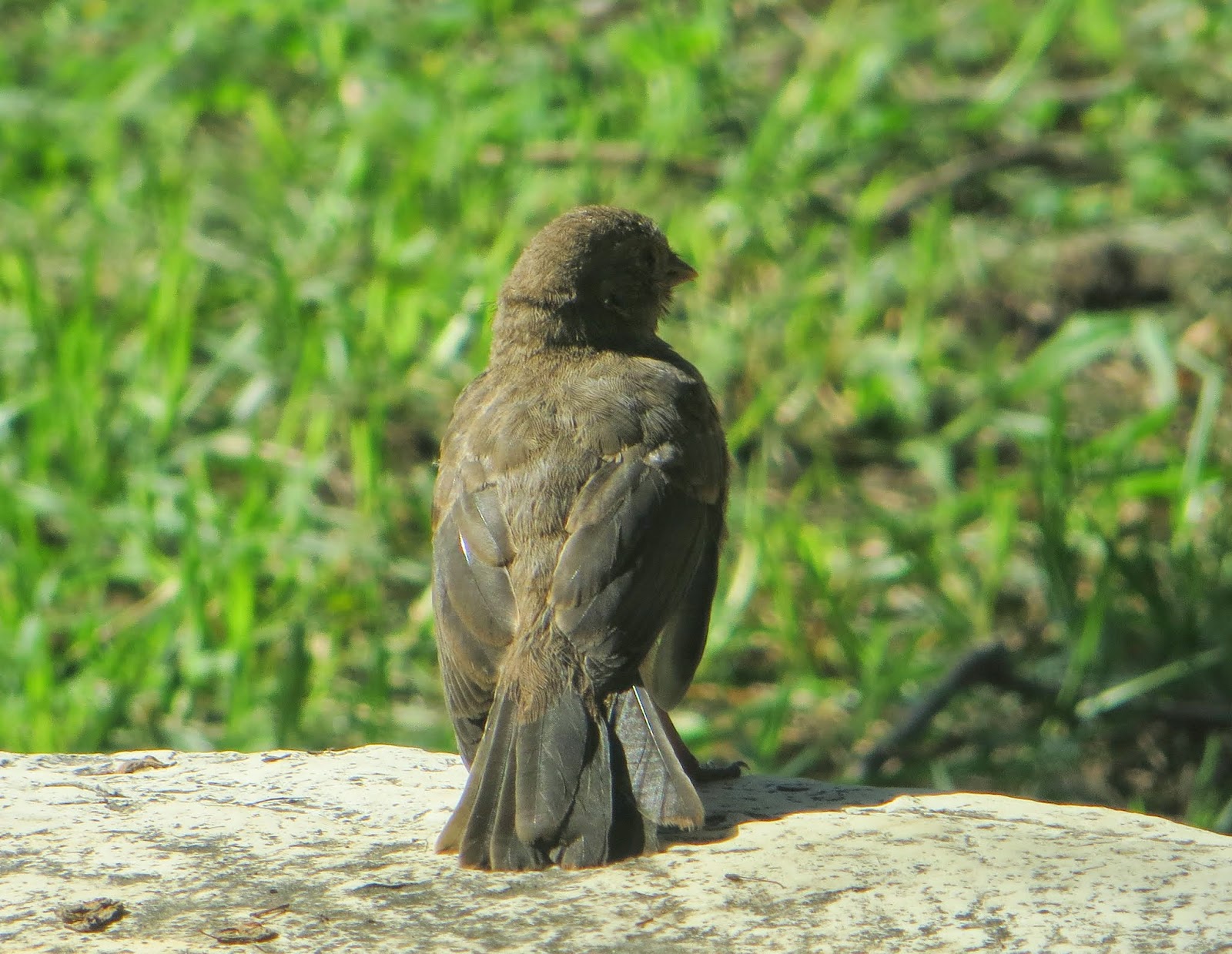 The California towhees must have had another nest, because there is a young bird that hangs around sometimes, begging its parents for food. Below is a photo of it sitting on a bench.