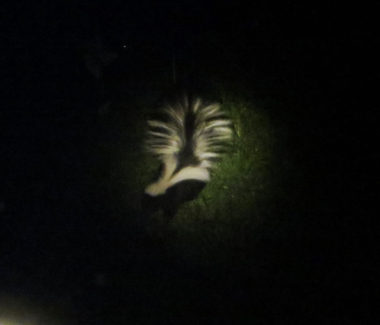 Recently, a striped skunk living in our yard raised two little babies. I don't see the mother that often, but every night, the two young skunks visit the cat food bowls. They are very small and very beautiful with their bold black and white fur. Below are four photos of them.