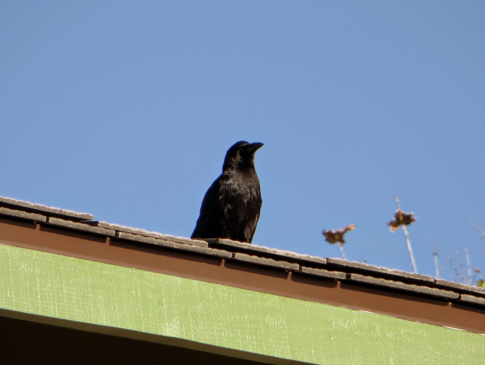 There were many American Crows around; sitting in trees, scavenging, and chasing a hawk. Below is a crow sitting on the roof of the nature center.