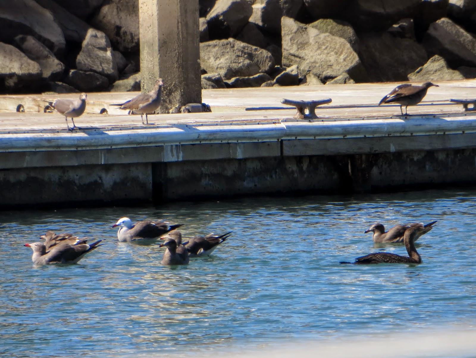 There were many cormorants in the harbor and out on the ocean, but very few of them were Double-crested Cormorants. There were one or two here and there in the harbor, often hanging around with groups of Heermann's Gulls. Below are two photos of Double-crested Cormorants with the gulls.