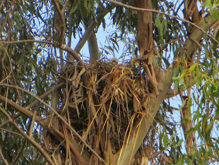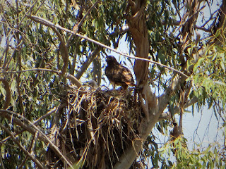 When we first arrived, a man pointed out a Red-tailed Hawk nest high up in a eucalyptus tree. He said he had seen two chicks, and that they were probably a couple weeks old. It was hard to see, since it was so high up, but we did see the two chicks, and later on, we saw a parent on the nest. The chicks were small, gray, and fluffy. Below are two photos of the nest. In the first, only one chick is visible. In the second, a parent is standing on the nest, and the head of one chick can be seen to the left (the top of the second chick's head can also be seen behind the parent, though it's difficult to see; it just looks like a lump).