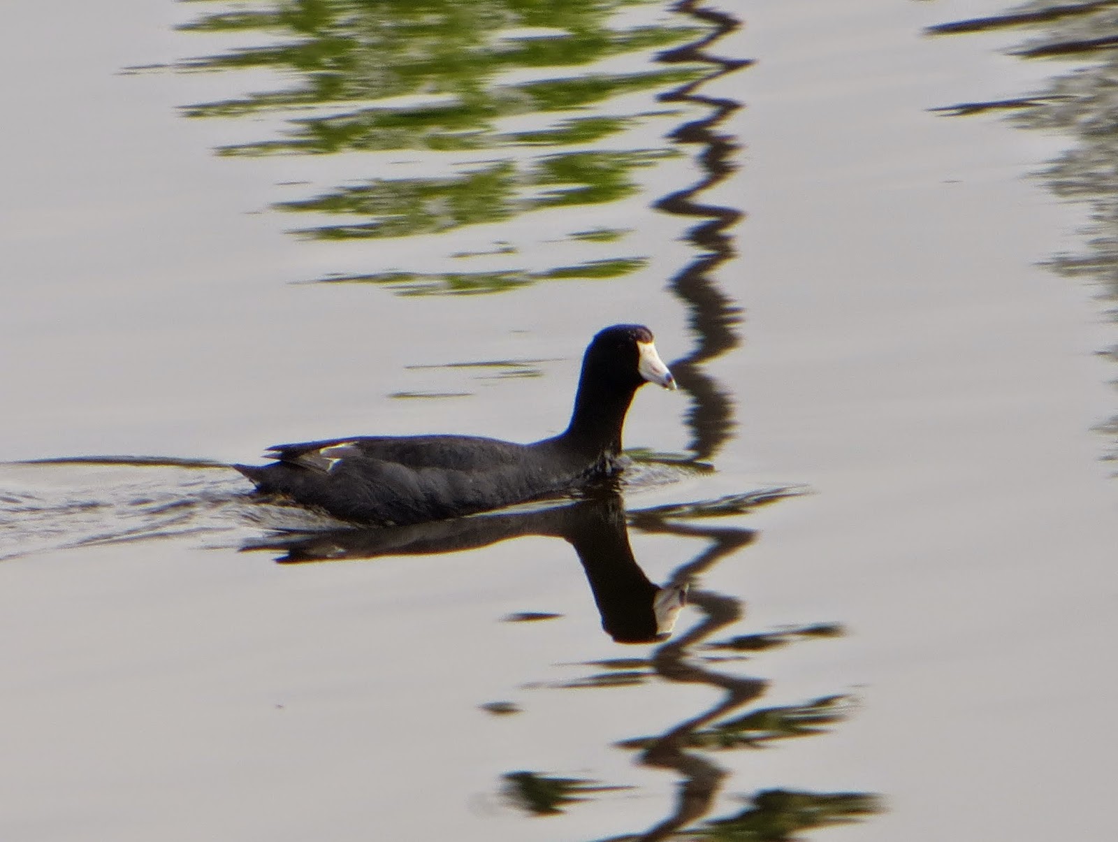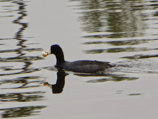 There were a few American Coots, though not very many. Below are two photos. The first is a coot swimming toward some people who were handing out bread to the ducks. The second is a coot (possibly the same one) swimming away from the people with a big chunk of bread in its bill.