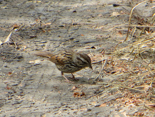 There were a few Song Sparrows around, shuffling on the ground or singing in the bushes. Below is a Song Sparrow foraging in the middle of the path.
