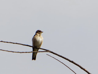 The were many swallows flying around above the lake and the fields. They were all Northern Rough-winged and Cliff Swallows. As they always seem to do, some of the Northern Rough-winged Swallows perched on the tops of bushes and trees. Below is a photo of one of them.