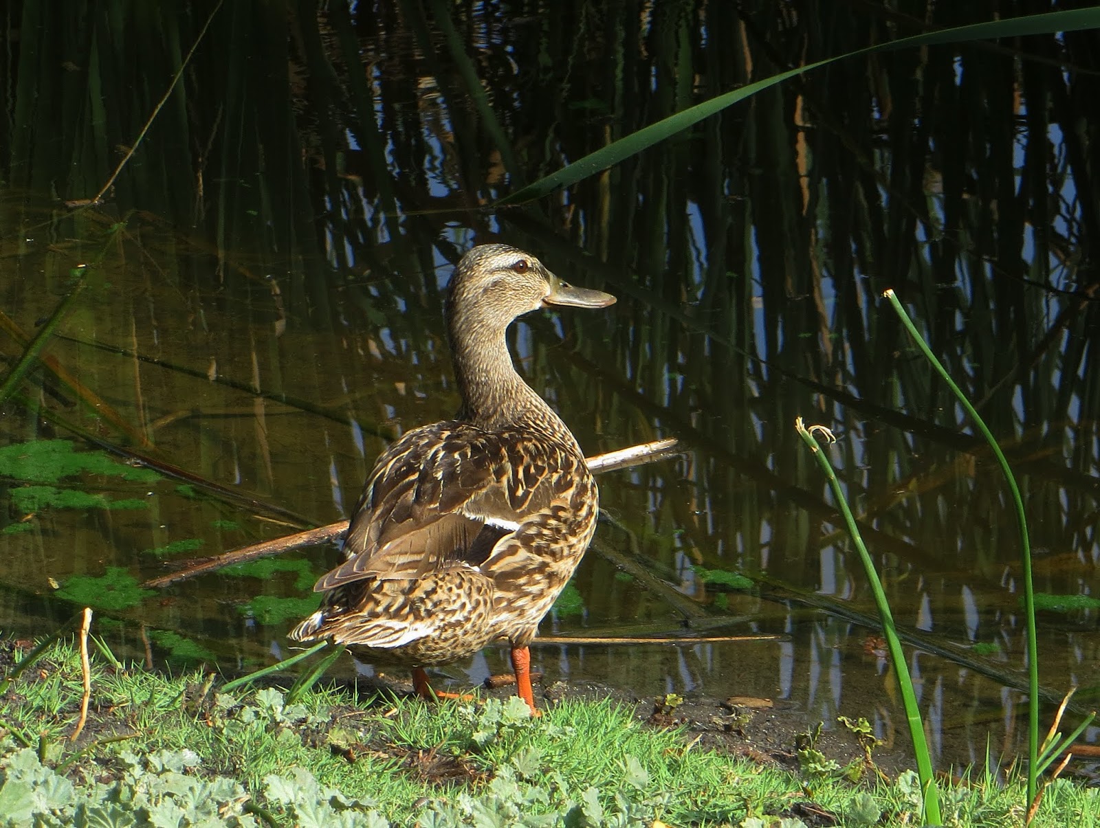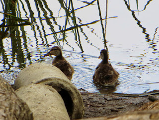 We also saw Mallard ducklings. They were slightly older, though still very fluffy. They were bathing in the water. There were quite a few Mallards looking for handouts, drinking, bathing, and sleeping on the grass. Below are two photos. the first is of the two ducklings, and the second is a female Mallard (not the mother).