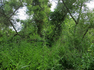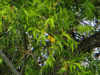 There weren't too many warblers around, but we saw a few here and there. We saw a couple of Yellow Warblers, but none stayed still long enough for a good photo. Below is a not-so-great photo of a male Yellow Warbler. It had nice, bold red streaks on its chest, though they can't really be seen in the photo. It blended in fairly well with the yellowish-green leaves.