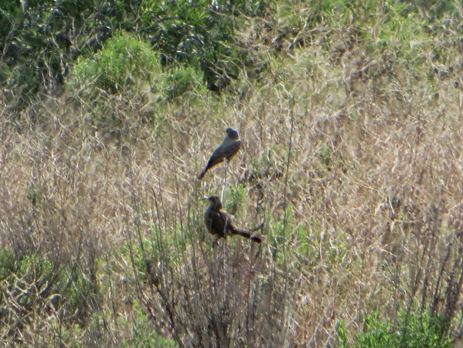 We saw a rather unusual sight at Guajome (well, we thought it was odd). We saw two birds perching right near each other in the bushes, and I thought they were both the same species at first (they were close to the same size and both looked dark from a distance). It turned out that one was a Cassin's Kingbird, and the other was a California Thrasher. I wouldn't have expected them to hang out so close together, but there they were. Below is a photo of the two (kingbird above, thrasher below).