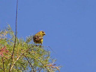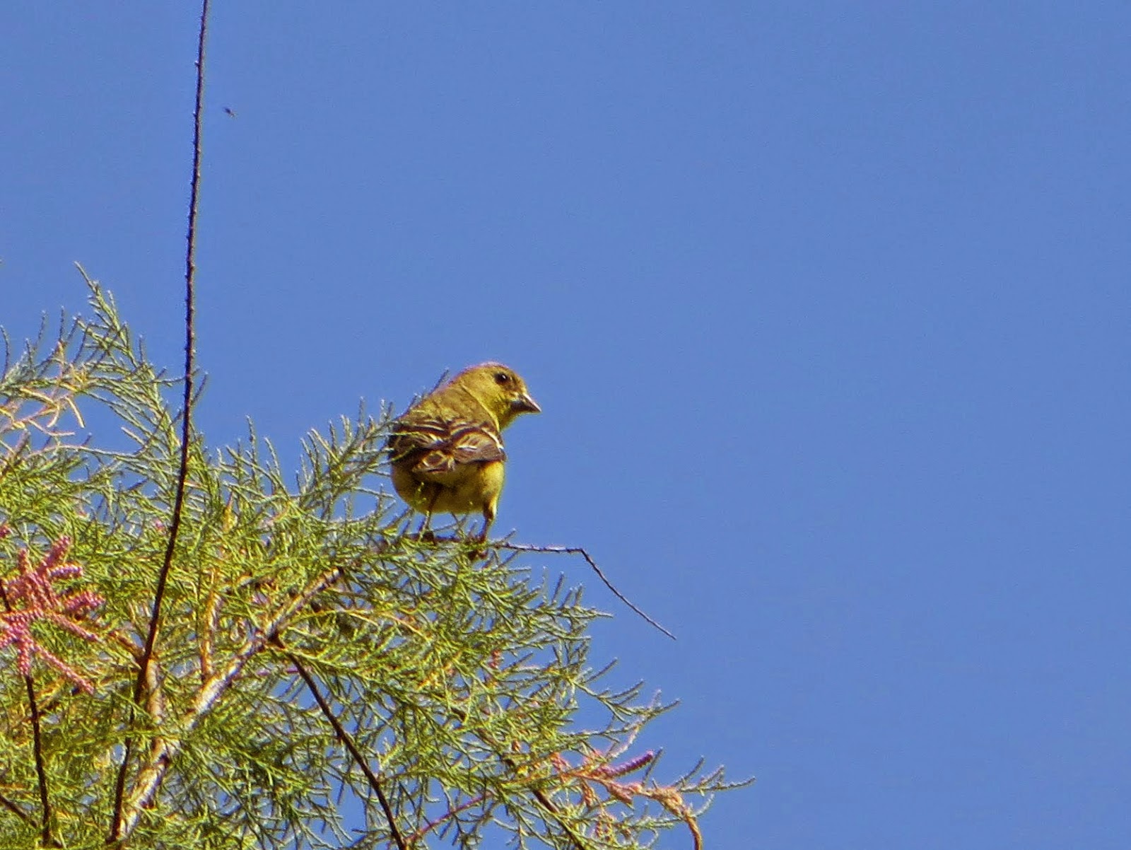 There were a couple of flocks of Lesser Goldfinches foraging atop the trees. Below is a female.