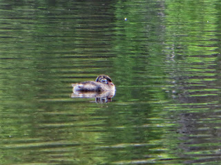 There were several Pied-billed Grebes on the lake. Most were in very nice spring plumage. There were also a couple of young, fluffy grebes with boldly striped faces and pink bills. Below are two photos, one of an adult Pied-billed Grebe, and the other of a young one that was drifting across the lake, asleep.