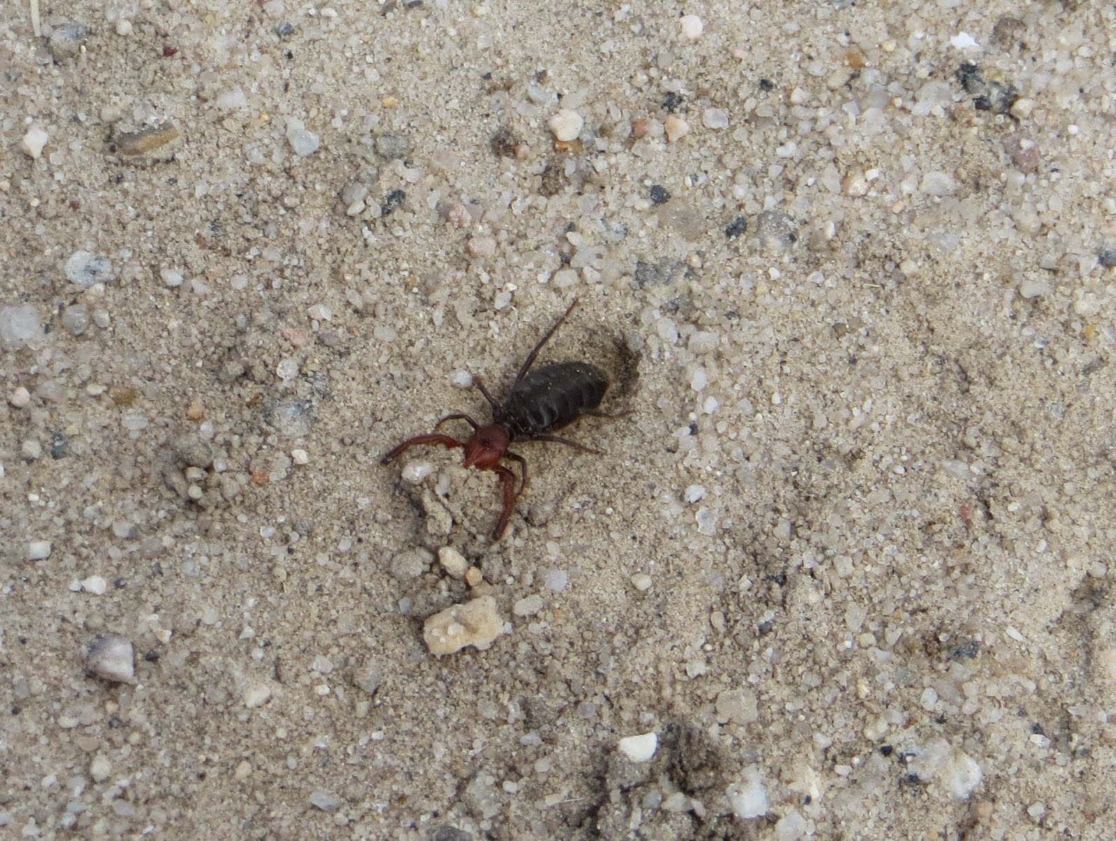 As we were walking on the trail, I noticed something moving back and forth very quickly across the ground. It was a small (maybe half an inch to three-quarters of an inch), unusual looking bug; some sort of arachnid. It was digging a hole with its head, then gathering up the dirt and pushing it across the ground away from the hole. After some research, I discovered that it was a wind scorpion (I don't know what species; there are over a hundred in the United States). They aren't scorpions, but their own separate group. They aren't poisonous, but can bite. They're very quick, and are mostly nocturnal. I'm not sure why the one I saw was digging a hole; maybe it was trying to build a burrow. It was very interesting to watch. Below is a photo of the wind scorpion pushing dirt.
