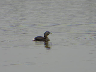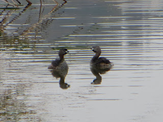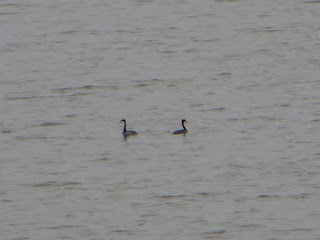 There were several Western Grebes at the lagoon, and one Clark's Grebe. The Clark's and one of the Westerns were hanging around together and, oddly, doing the head-bobbing typical of a courting ritual. Below are the Clark's and Western Grebes (Clark's on the left, Western on the right).