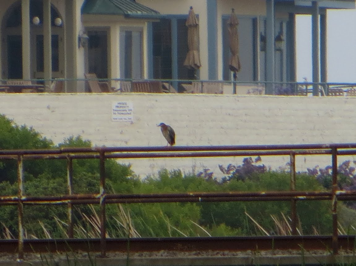 We saw one Green Heron perching on the metal railing of a railway bridge that goes over the lagoon. Below is a photo of it (sorry it's not clear; it was very far away).