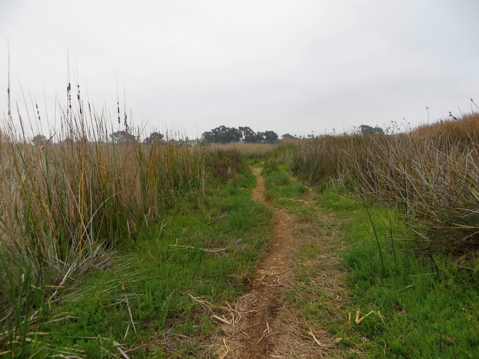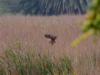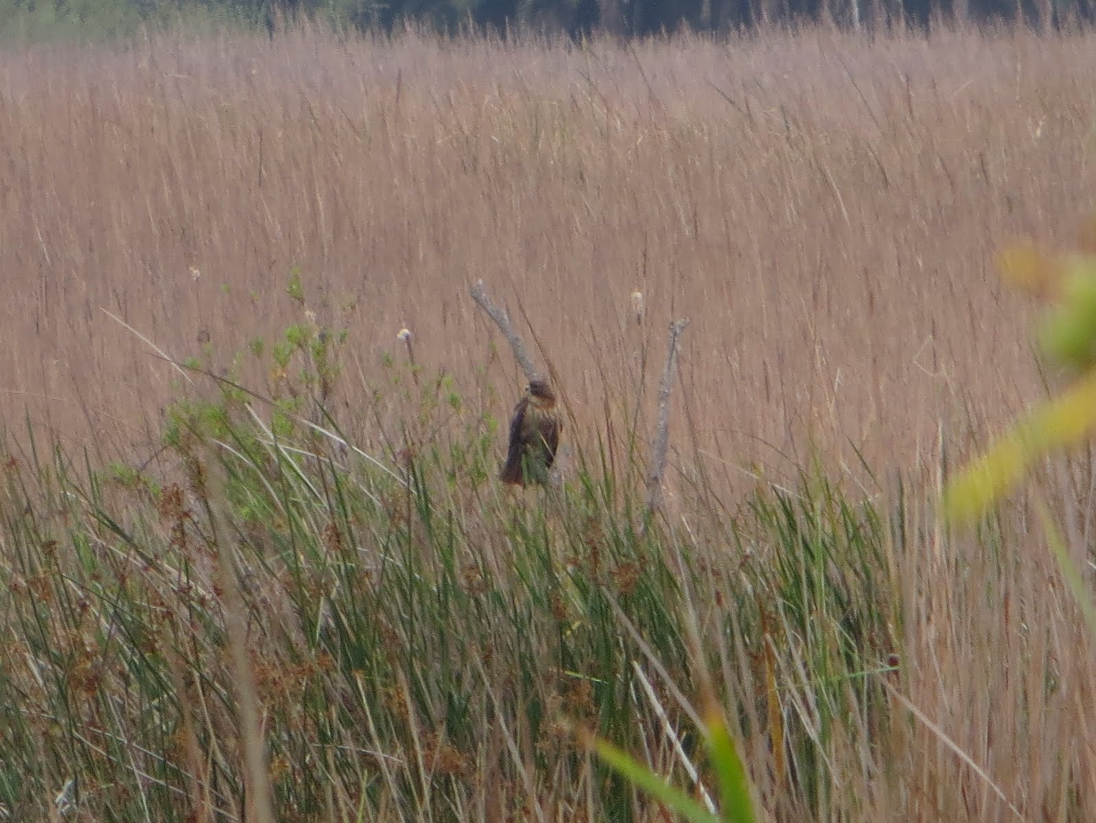 We saw a Red-tailed Hawk, though not in the usual place high up in the trees or soaring around. It was perching on a branch very low, almost at the ground, among the reeds. It sat there for awhile, stretching its wings occasionally. Then it flew up to sit on a slightly higher perch. Below are two photos of it. In the first it is on the lower perch, and in the second, it is stretching its wings while sitting on the higher perch.