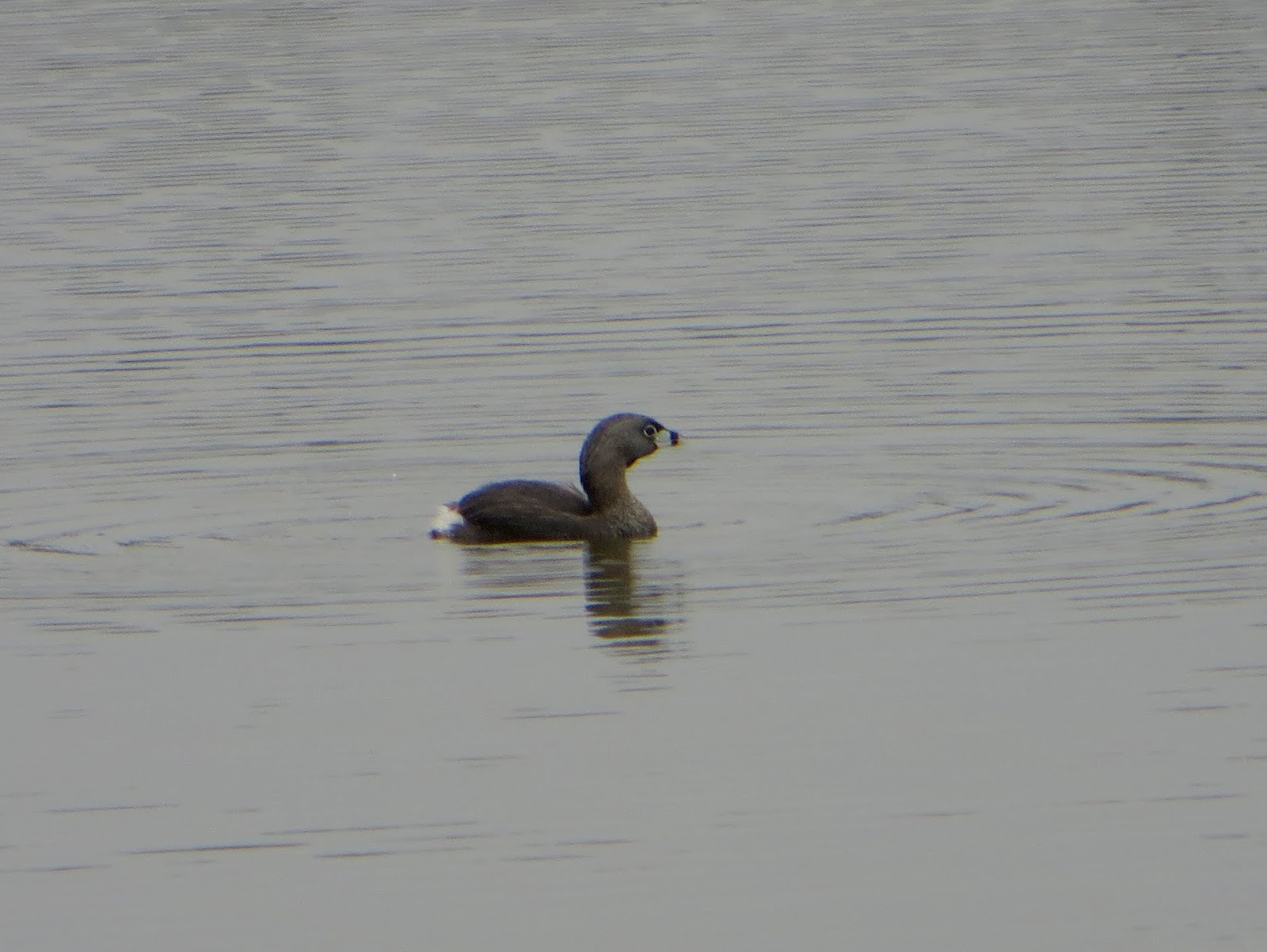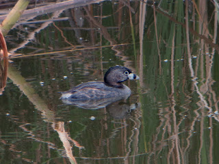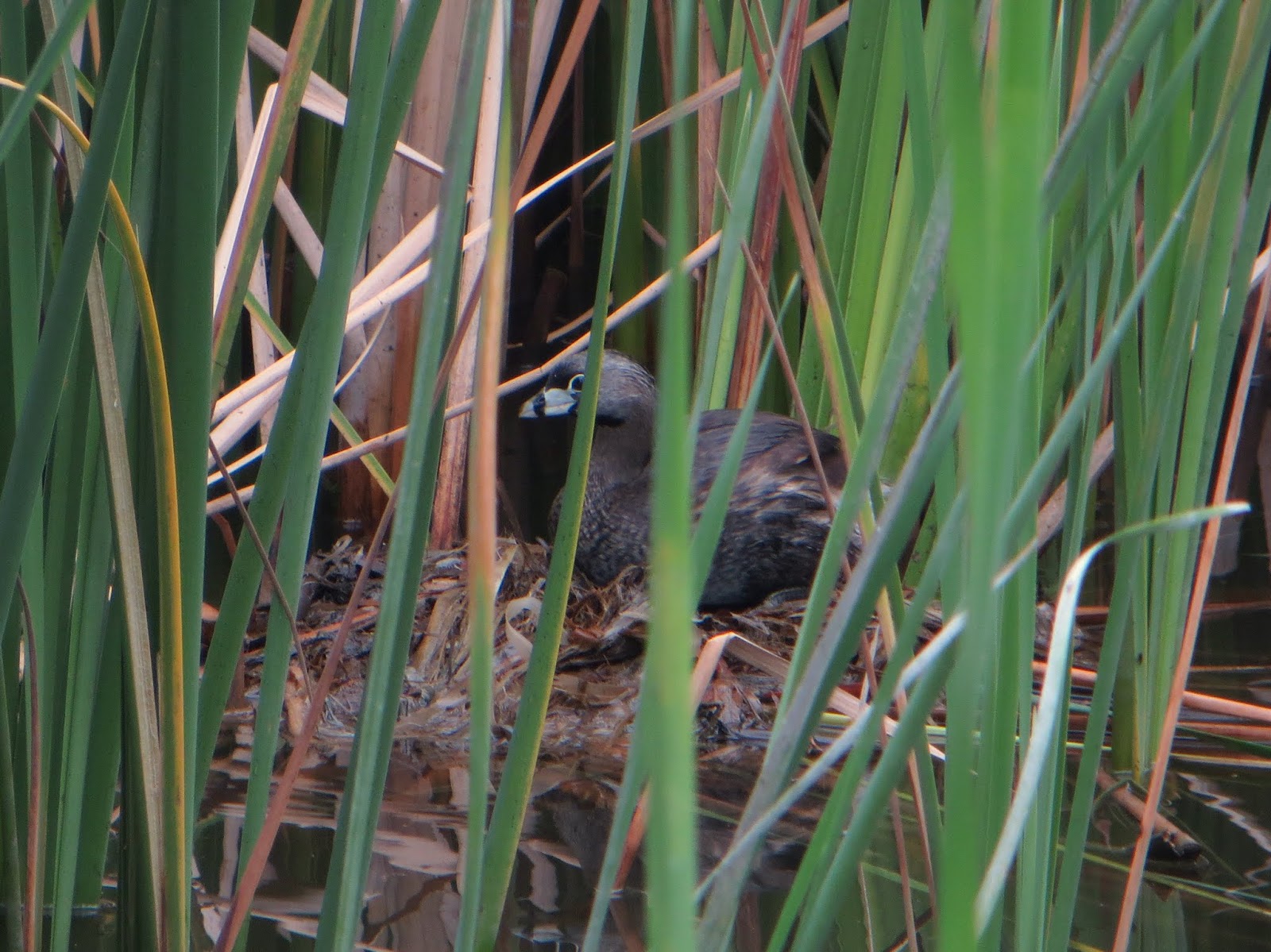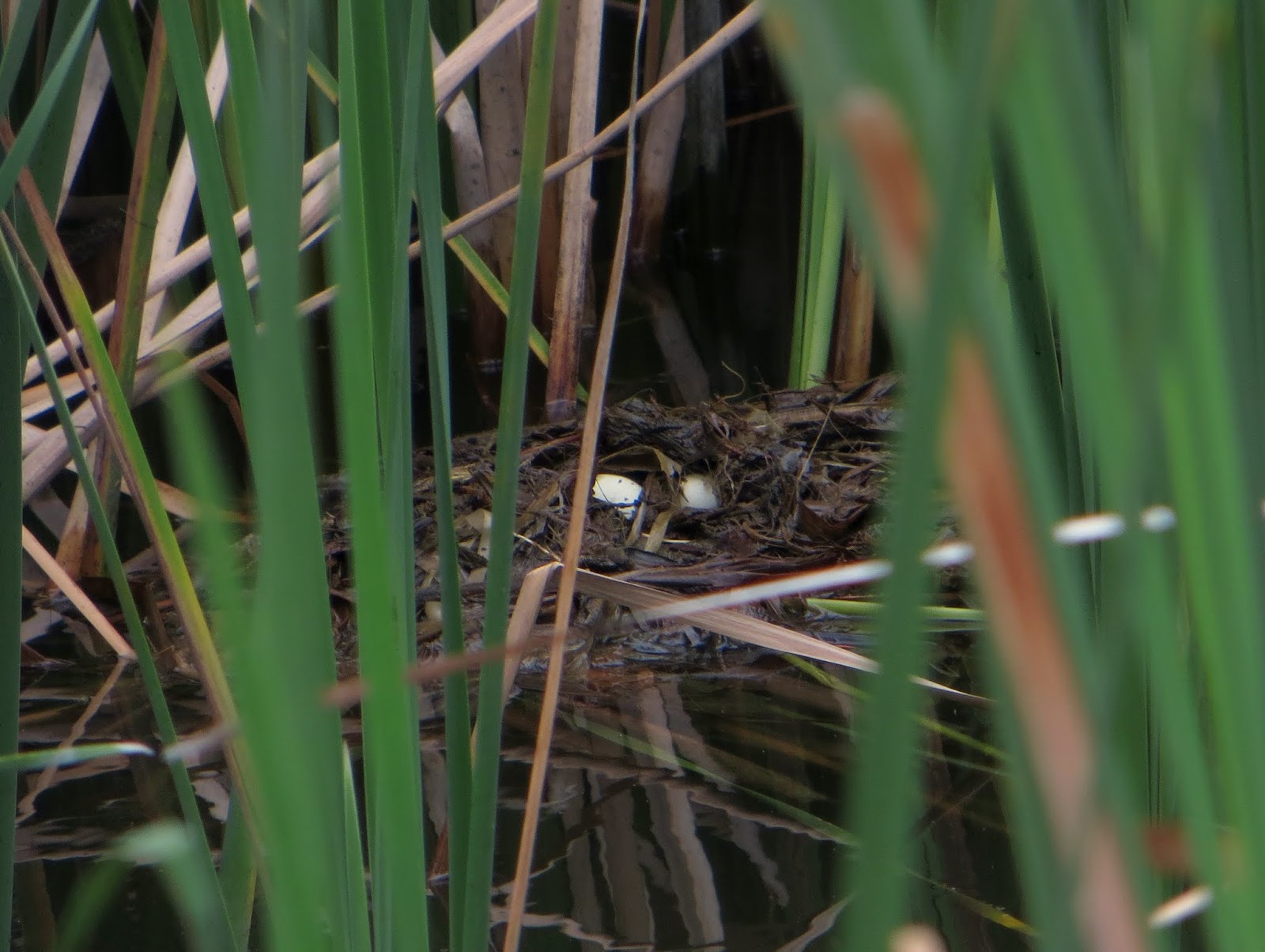 Walking alongside the road, I heard a rustling in the reeds. I walked quietly and saw a Pied-billed Grebe sitting on a pile of reeds and other plants. It stood every now and then to tuck the plants in around it, and I realized that it was a nest. Later on, after it had tucked some more material into the nest, it got up for a swim and I saw a couple of little white eggs. Below are five photos. The first three are various Pied-billed Grebes I saw. The fourth is the grebe sitting on the nest, and the fifth is just the nest with two eggs visible.
