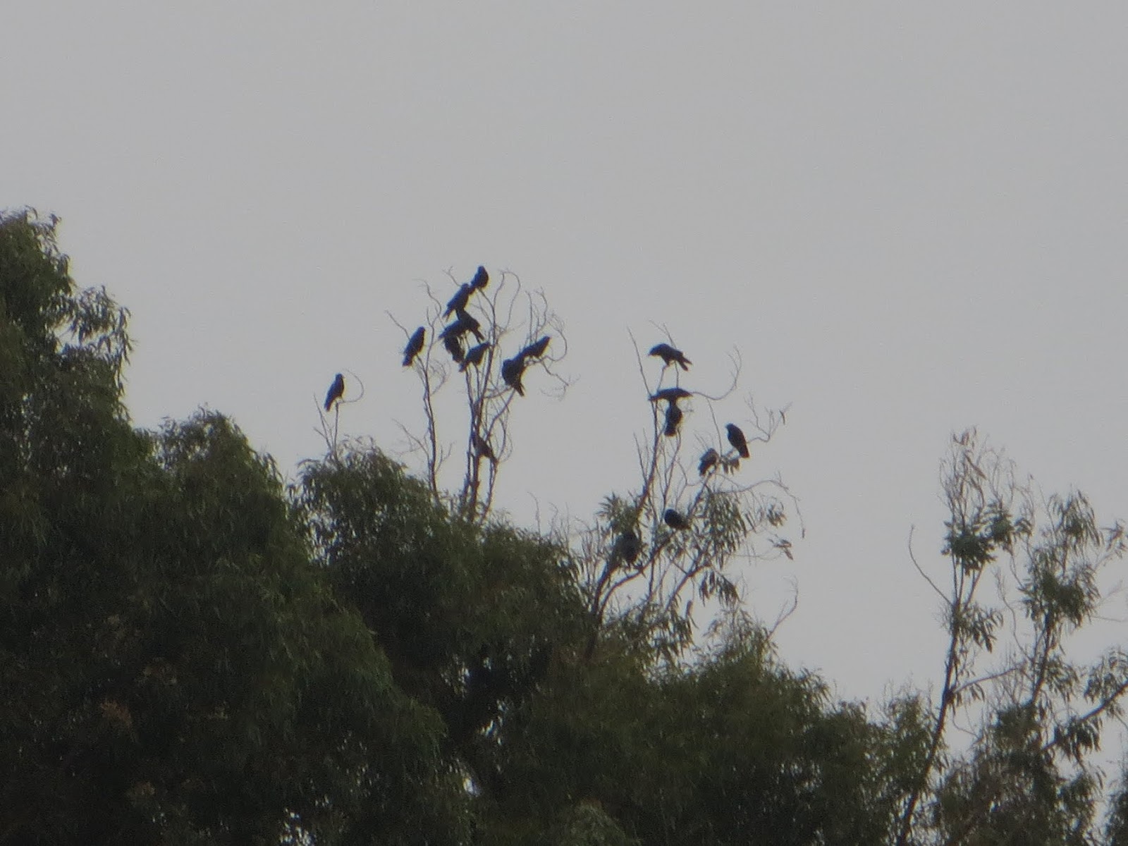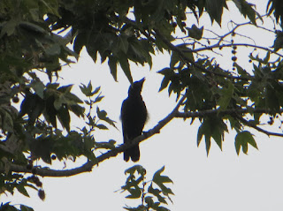 There seemed to be more American Crows around than usual. There was one very large flock in the morning, and then quite a few scattered around. There were also a few young, fluffy crows, begging their parents for food. Below are two photos. The first is of part of the large flock sitting in the trees, and the second one is of a young crow (notice its fluffy sides).