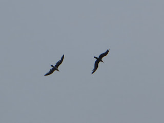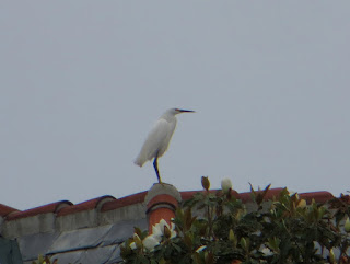 We didn't see very many egrets at the lagoon, only a few here and there. We did see both Snowy and Great, though. Below are two photos of egrets. The first is of a Snowy Egret standing on the roof of a house, and the second is of two Great Egrets flying over.