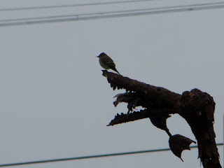 One bird we saw that we don't usually see at the lagoon was a Western Wood-Pewee. I usually see a few of the in my backyard every summer, but I don't recall ever seeing very many at the lagoon. Western Wood-Pewees summer in western North America and winter in northern South America. They are small flycatchers usually found in wooded areas. They are grayish-brown overall with a paler gray throat, paler and slightly yellowish belly, and dull white wing-bars. They can be most easily distinguished from similar-sized and patterned flycatchers by their overall grayish color (as opposed to the yellowish-green color of birds such as Pacific-Slope Flycatchers) and their lack of an eye-ring. Below are two photos of the Western Wood-Pewee (the thing it's perched on in the second photo is a statue of a giant toothed heron eating a duck).