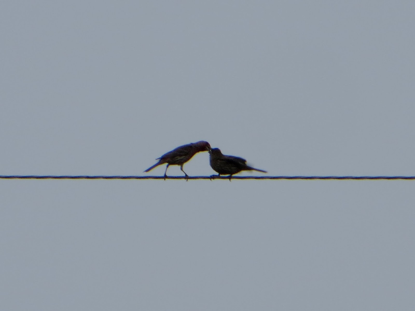 There were quite a few baby birds at the lagoon, especially songbirds. Behind the nature center there were a lot of young Common Yellowthroats, Marsh Wrens, and Song Sparrows all hopping around and cheeping in the reeds. In front of the nature center, there were a few young House Finches, following their parents everywhere. Below are two photos of a young House Finch and its parent (the young one is the one flapping its wings).