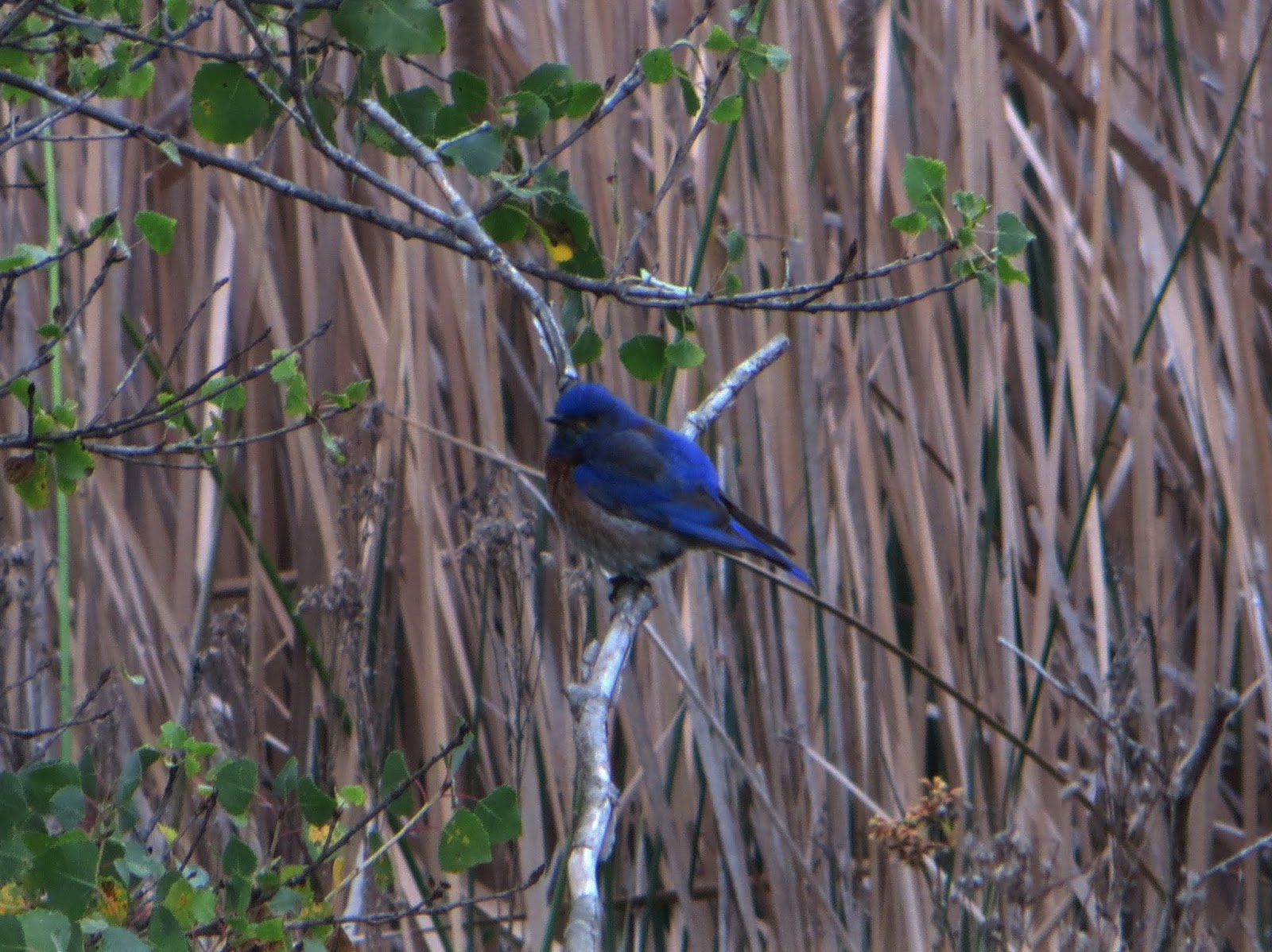 We also saw a very brightly colored Western Bluebird. It sat on a branch out in the open for a long while, then hopped away in the bush. Below is a photo of the bluebird (sorry that it's dark; it was very cloudy).