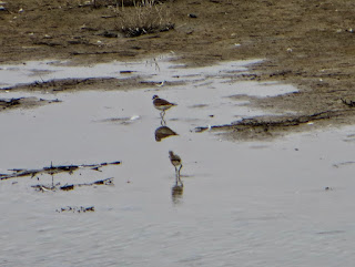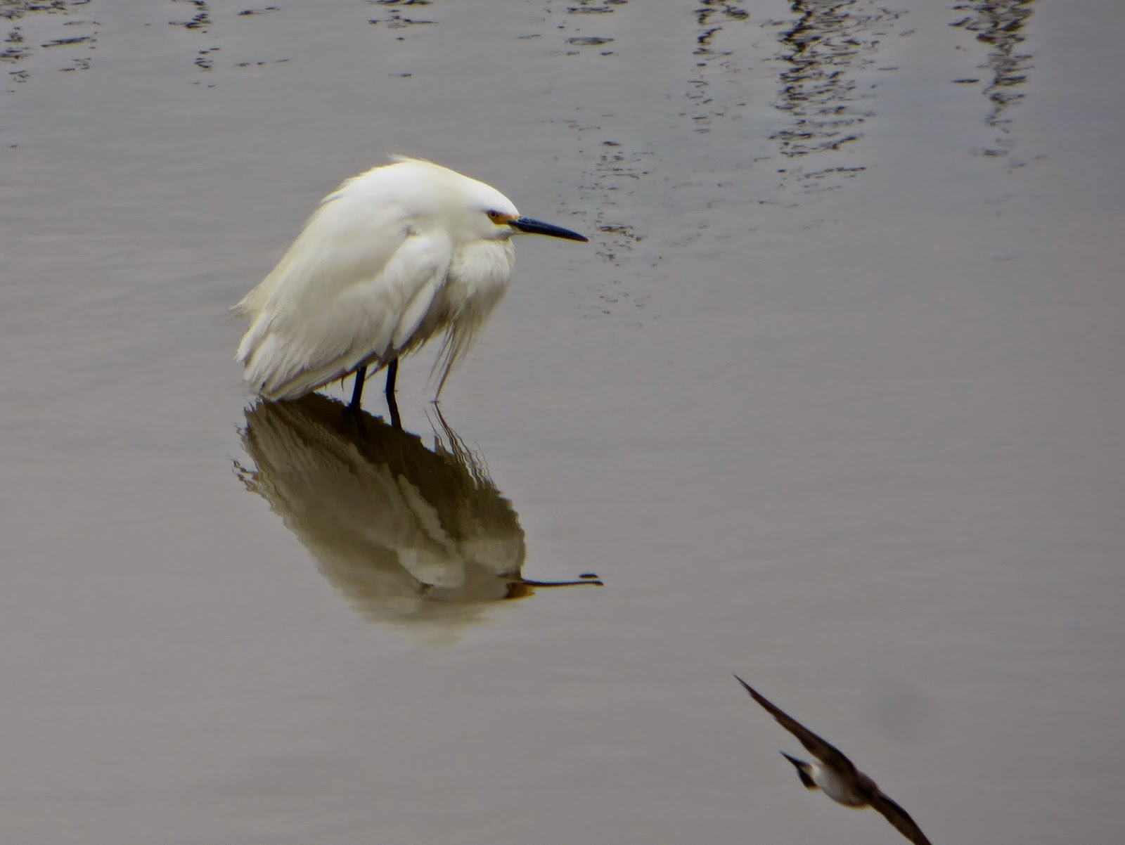 There were a few Snowy Egrets around. Two of them may have been a pair, since they seemed to be foraging together. Below are three photos of them. In the second photo, there is a Northern Rough-winged Swallow flying by in the corner.