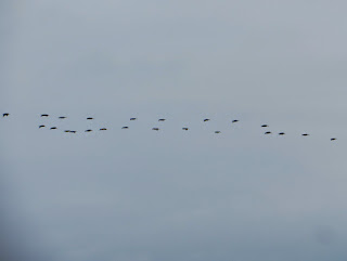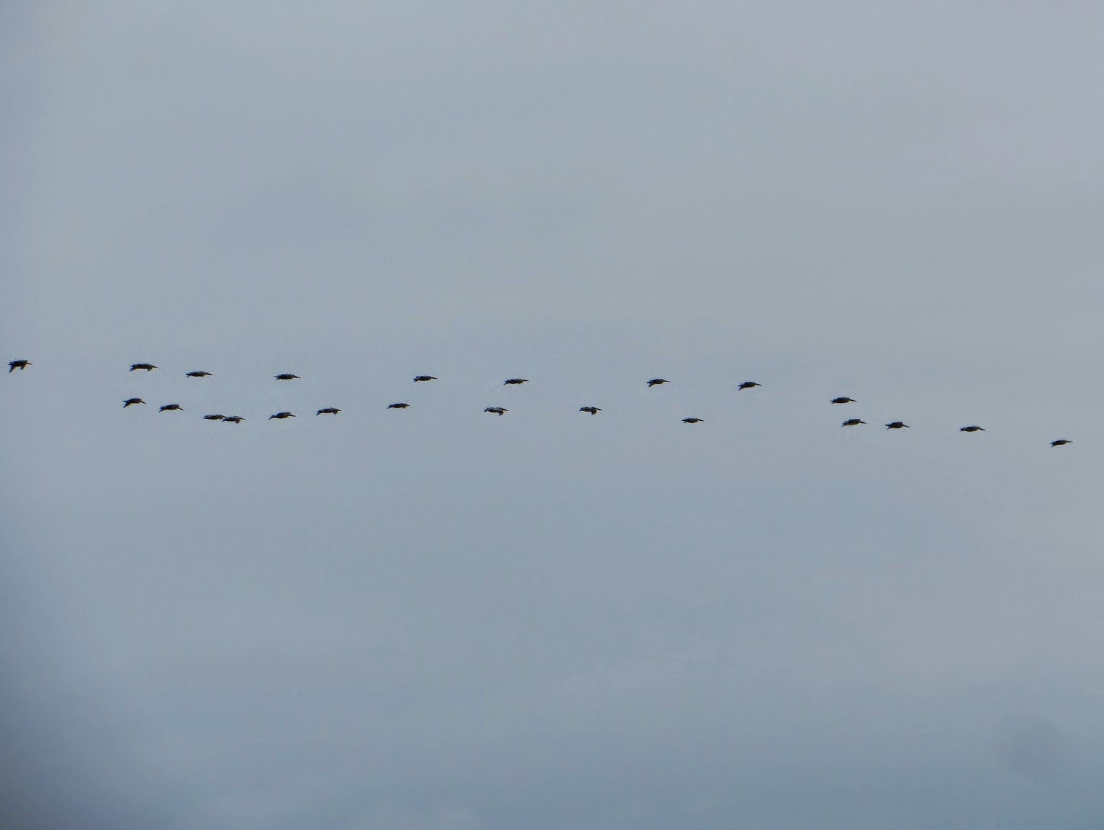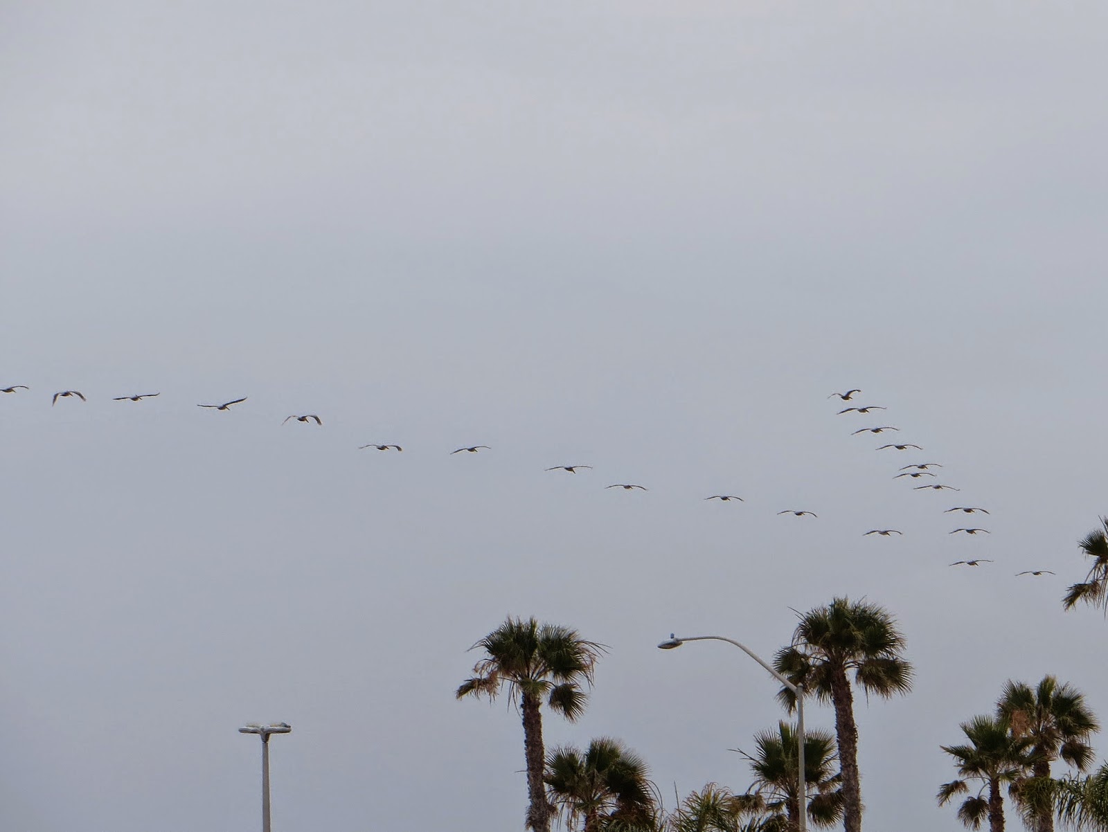 A large flock of Brown Pelicans flew over the ocean in a long V shape. There were probably about twenty-five to thirty pelicans in the flock. Below are three photos of them.