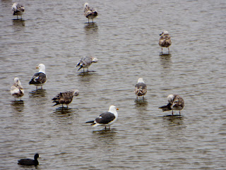 There was a large flock of Western Gulls standing in the water. A few other birds were moving around in the flock as well. Below are two photos. In the first are twenty-eight Western Gulls, an American Avocet (bottom left), and a Black-necked Stilt (bottom right). In the second are ten gulls and an American Coot.