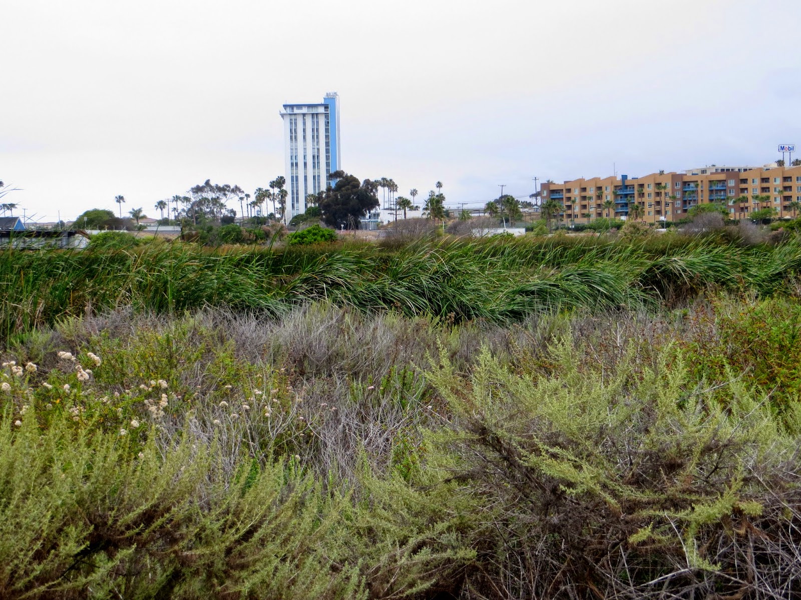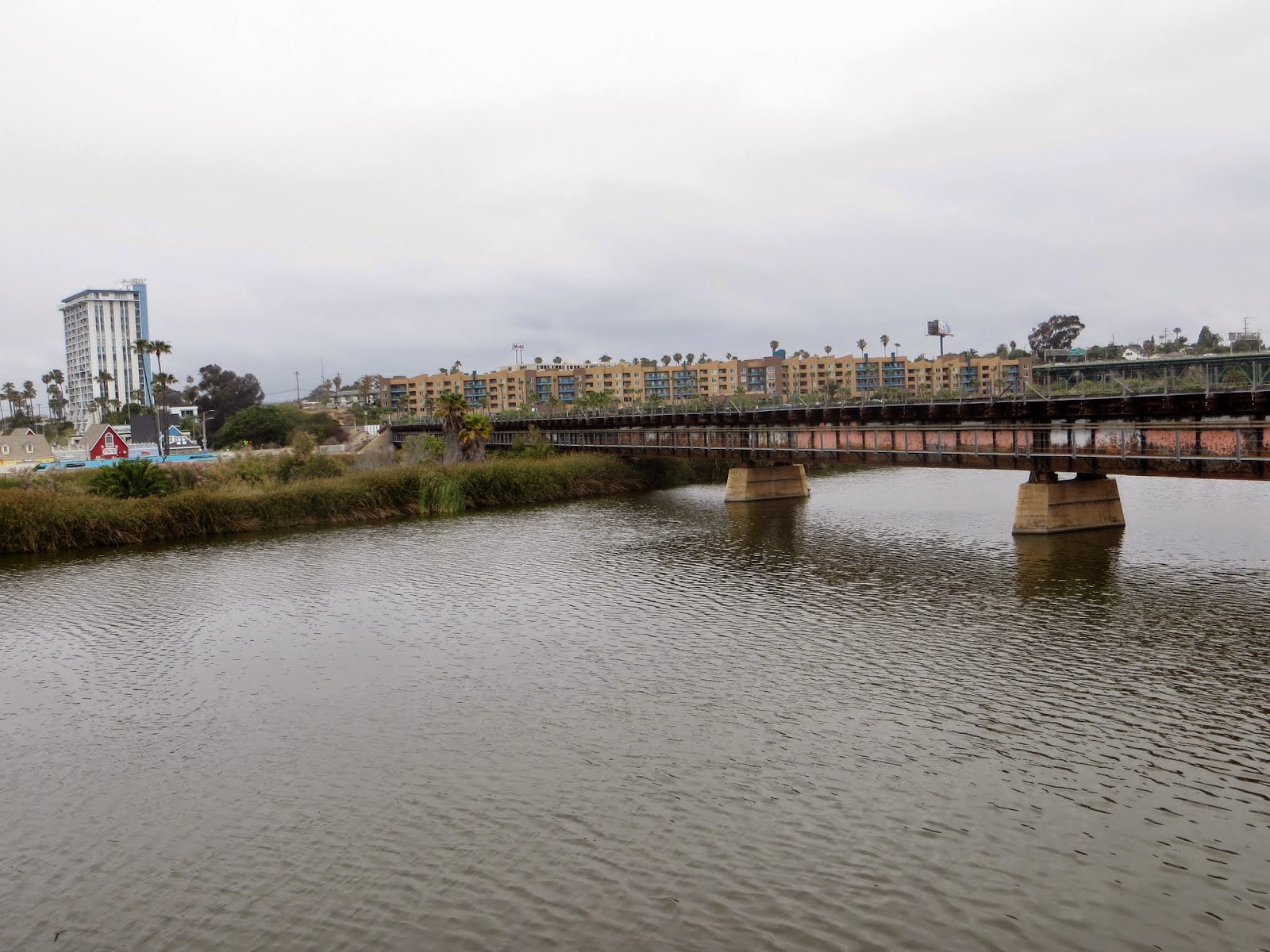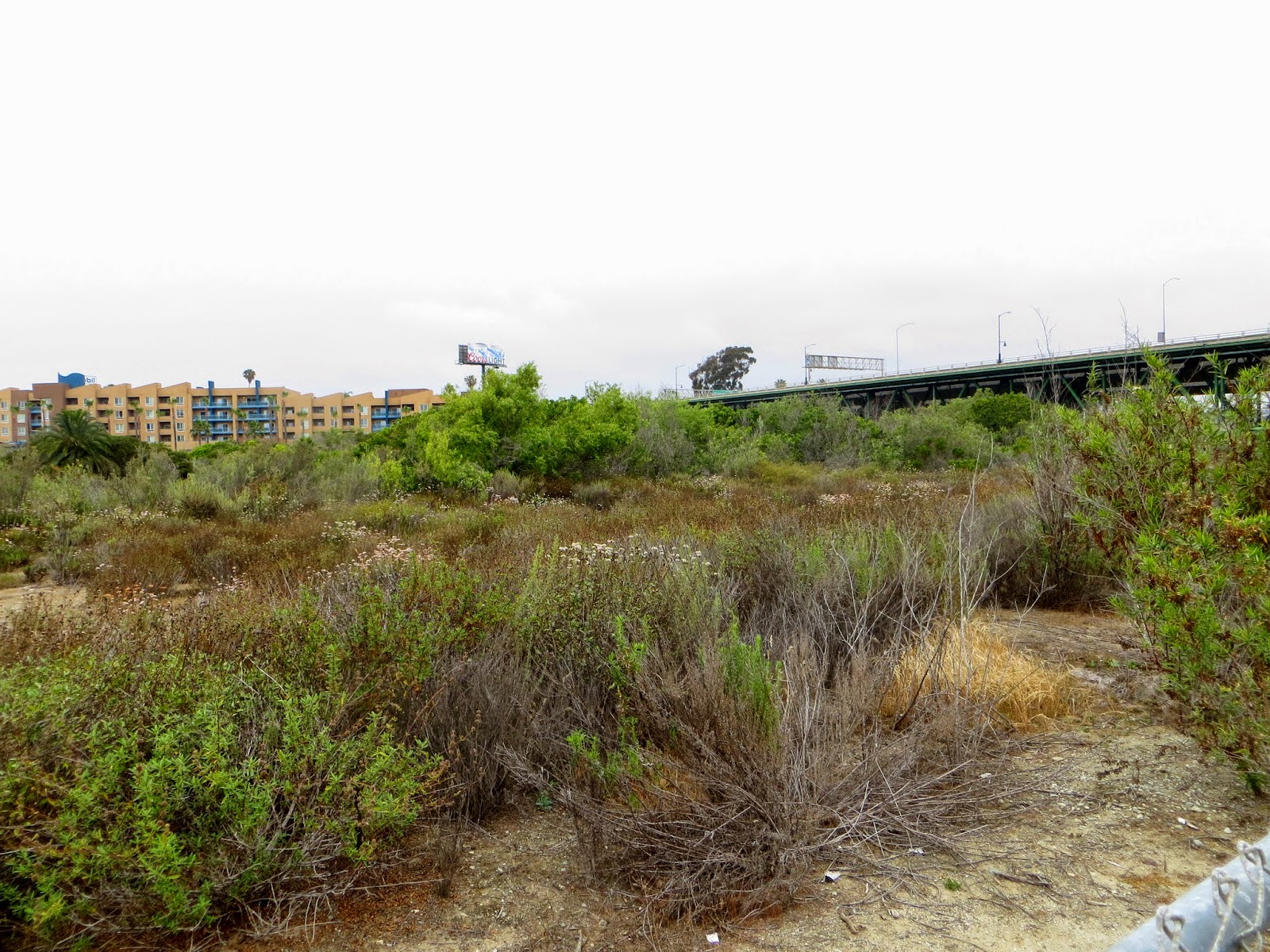On Monday, May 25, my dad and I went birdwatching at the mouth of the San Luis Rey River. It was very cloudy for much of the day. We walked along a bike trail. Below are five views from a bridge and along the trail.