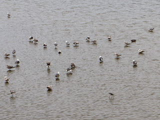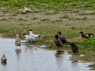 There were also several Double-crested Cormorants and Caspian Terns. Two of the terns appeared to be in a pair. Below is a photo of a couple of gulls, three cormorants, and two terns (the terns are only barely visible behind the bushes to the right of the photo).