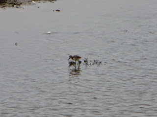 There were a couple of American Avocets. They seemed to be a pair, and had a couple of fluffy gray chicks, one of which became confused and followed a Killdeer around for a while. One of the adult avocets seemed very determined to make a wide open space for itself and chased away all of the stilts and gulls from that space. American Avocets are found in the western United States and southern Canada in the summer, and in the southeastern United States, Mexico, and part of Central America in the winter. They are found in southern California and southeastern Texas all year round. They are very distinctive with their white bodies, black and white wings, long bluish-gray legs, and thin, upturned bills. In the summer, their heads and necks are reddish colored, and in the winter they are gray. Below are seven photos of the avocets. The first two are the two adults (the darker-colored one was the more aggressive one). The next three photos are of one of the adults chasing away three different gulls. The last two are of the chicks (in the very last photo, the chick is following the Killdeer).