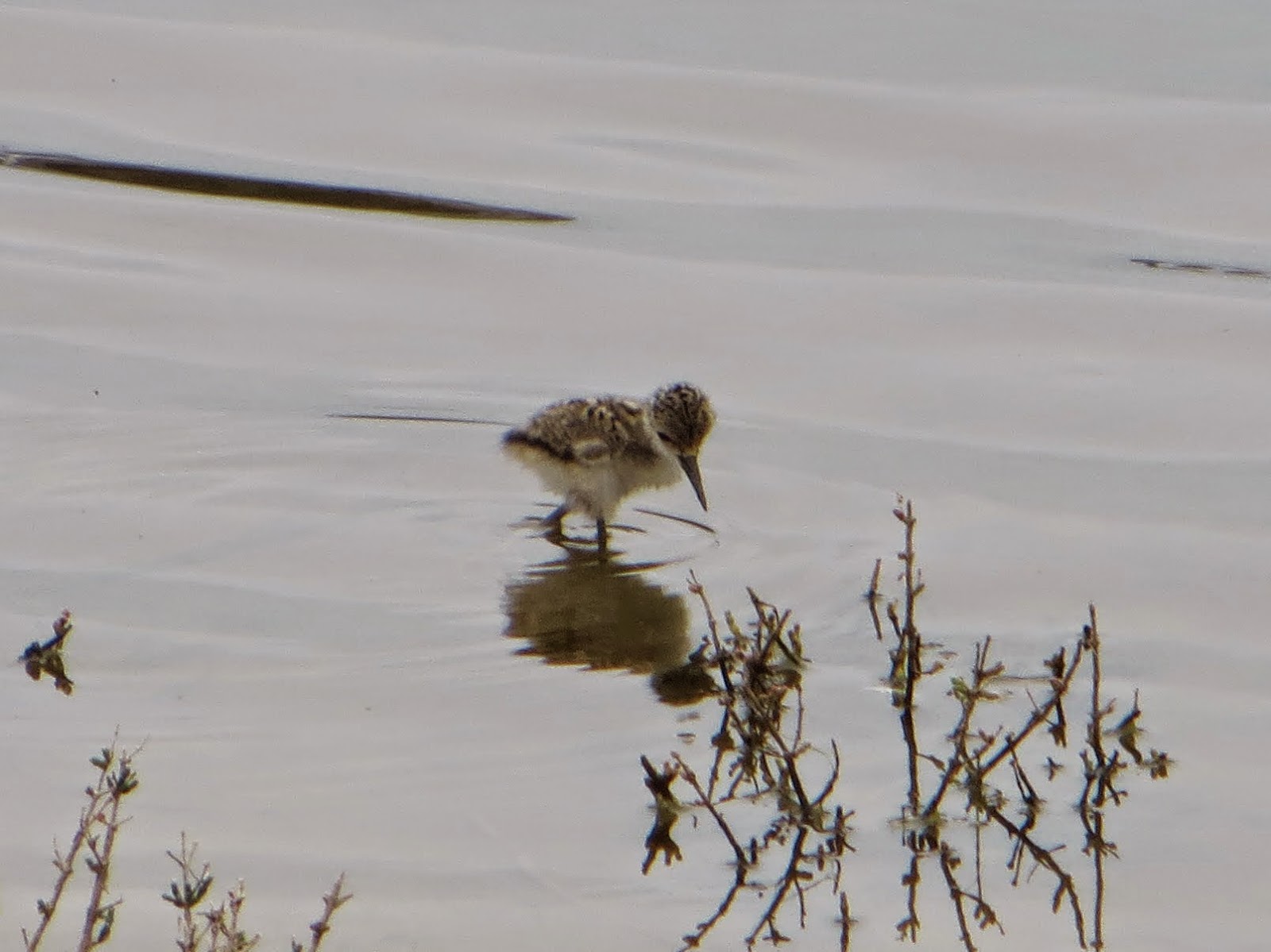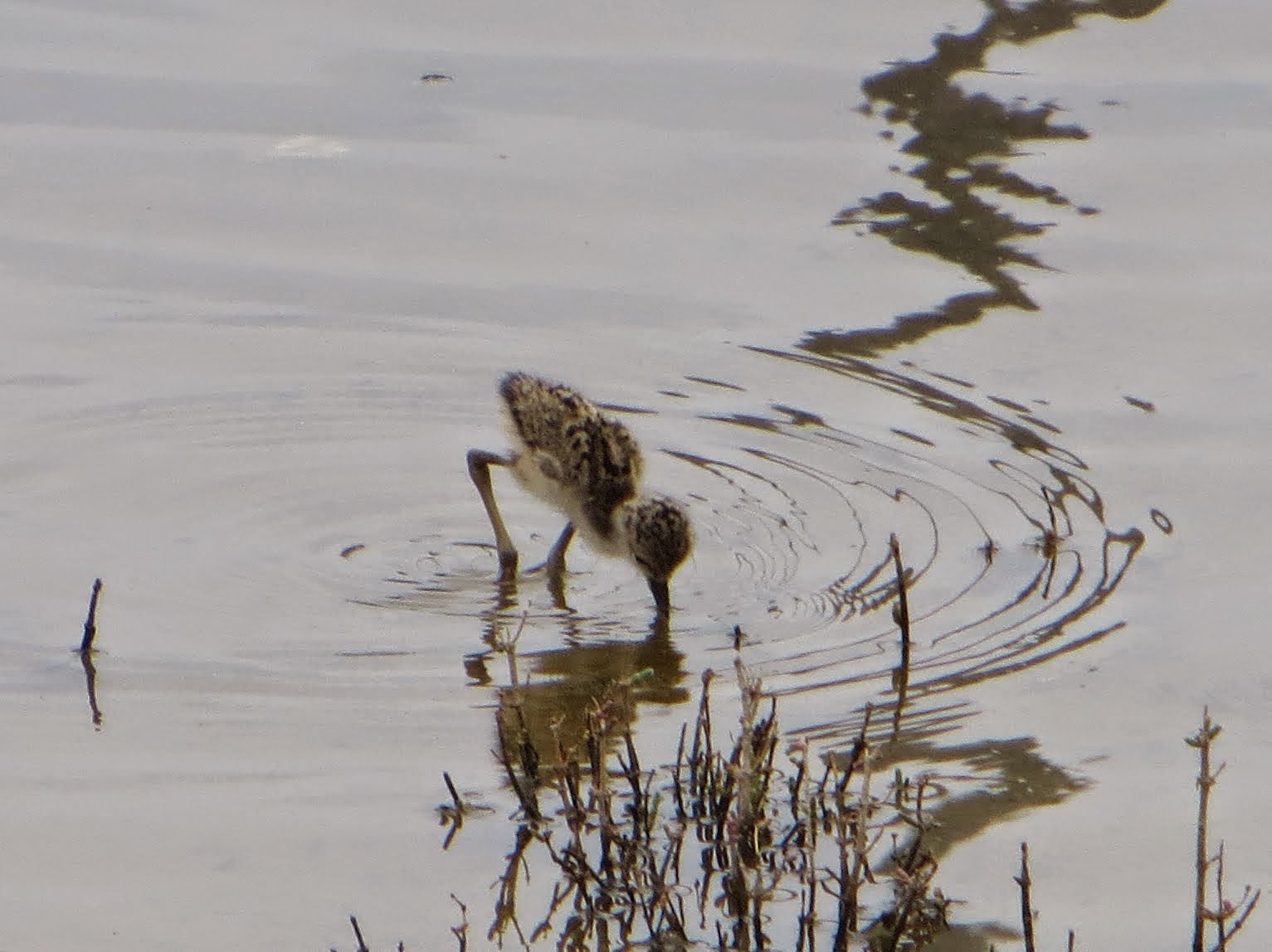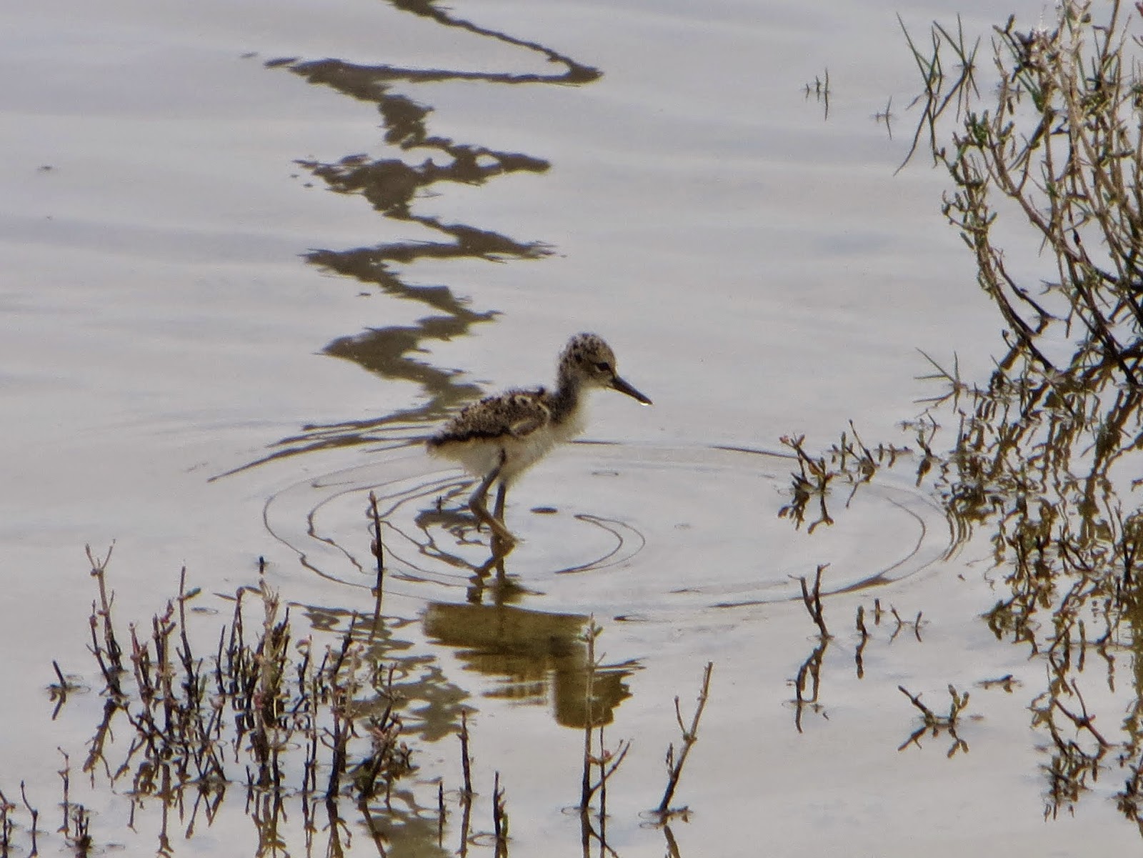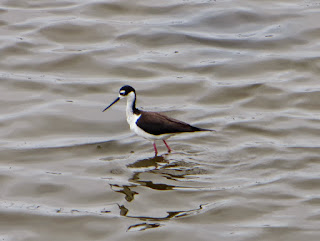 There were quite a few Black-necked Stilts at the river. Two of them were in a pair and had a little fluffy chick. One of the parents was scolding my dad and me very loudly. Black-necked Stilts are found in the western and southern United States in the summer and parts of Central America in the winter. They are found along the southern coasts of the United States as well as much of Mexico and parts of South America all year round. They have a very striking black and white plumage. They have black backs and wings, white fronts, and a white spot above either eye. To me, their pattern is somewhat reminiscent of an orca. They also have black, needle-like bills and extremely long, thin red legs. Below are seven photos of the stilts. The last three are of the chick.