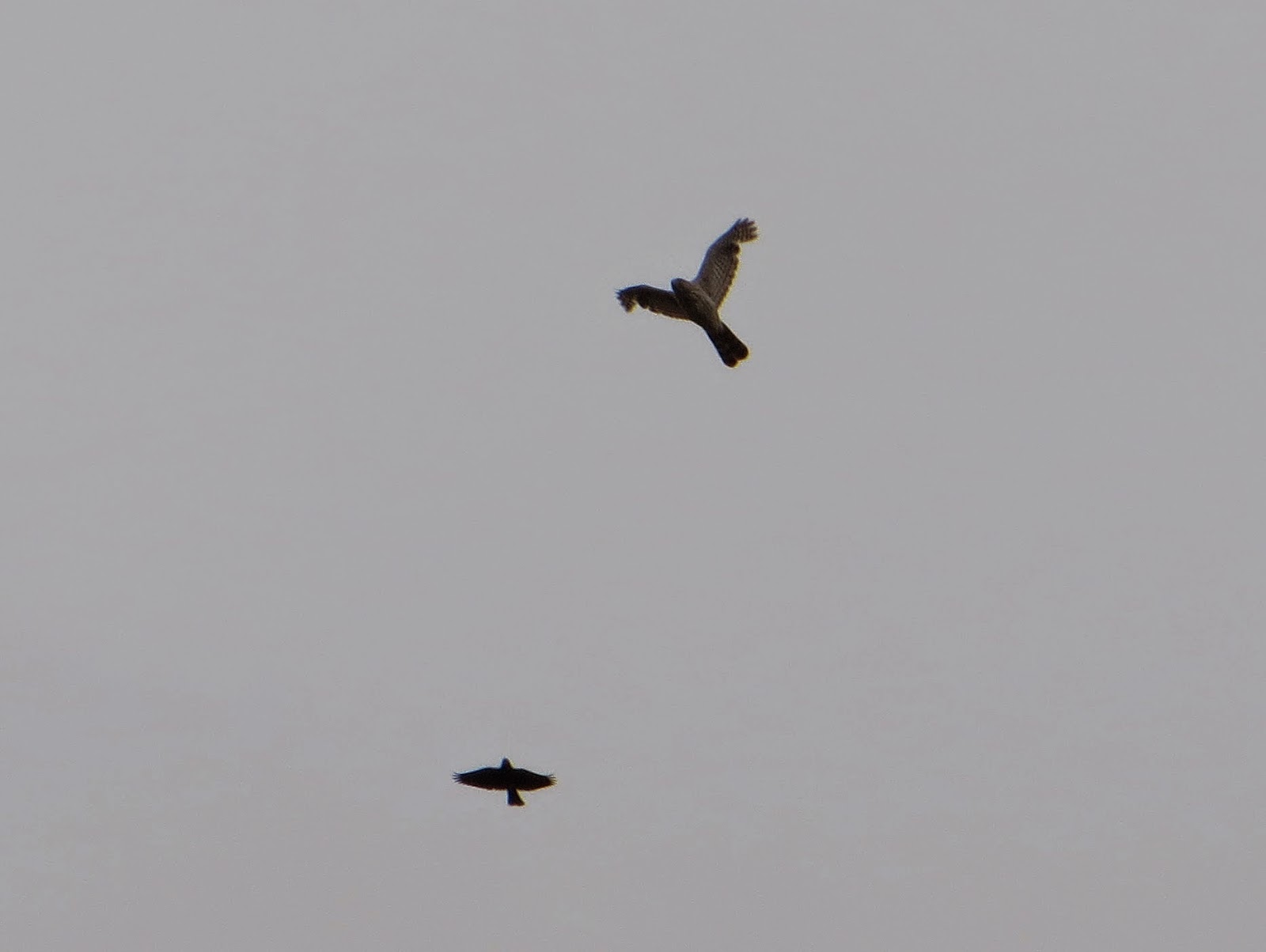 A Cooper's Hawk flew over the river and a large flock of blackbirds, grackles, and a few others chased it. In the end, only one red-winged blackbird continued chasing it. Below are three photos of the blackbird following the hawk.
