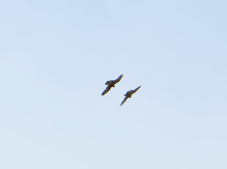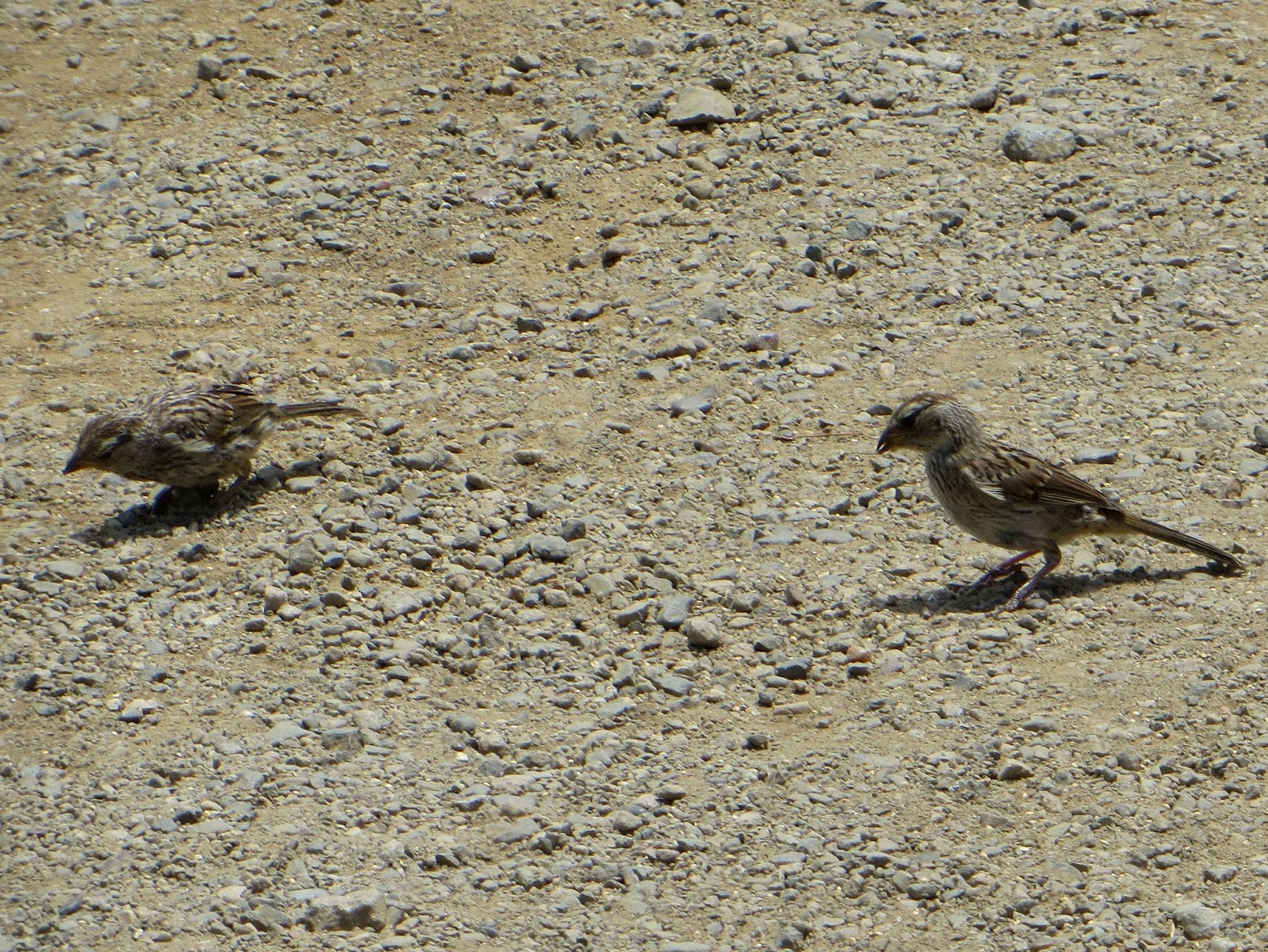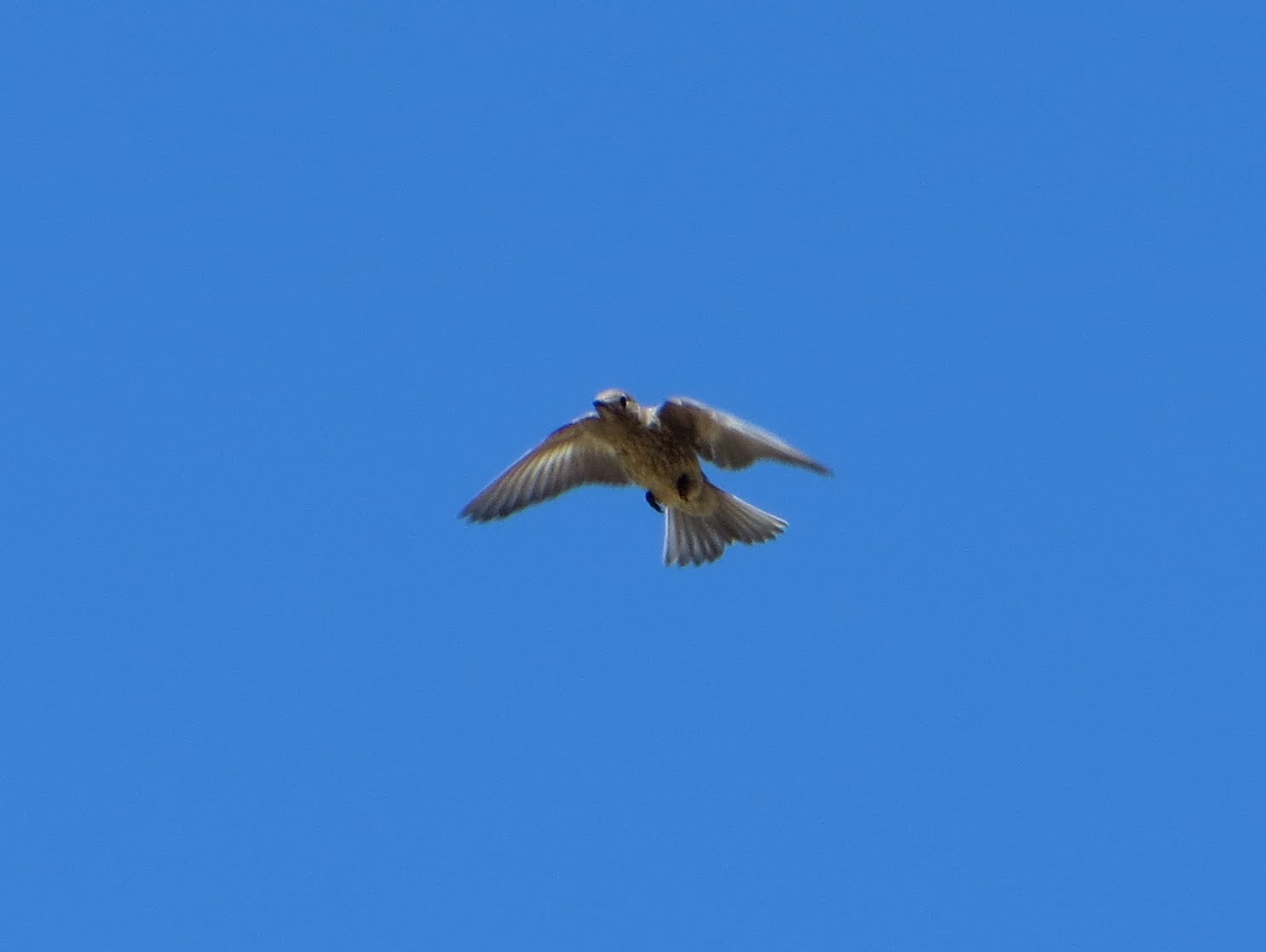 There were a lot of Western Bluebirds out in the fields, hovering above the grass and perching on top of bushes. There were quite a few young, brown spotty bluebirds flying around. Below are two photos of the bluebirds. The two in the first photo are adults, and the one in the second photo is a young one hovering above the grass.