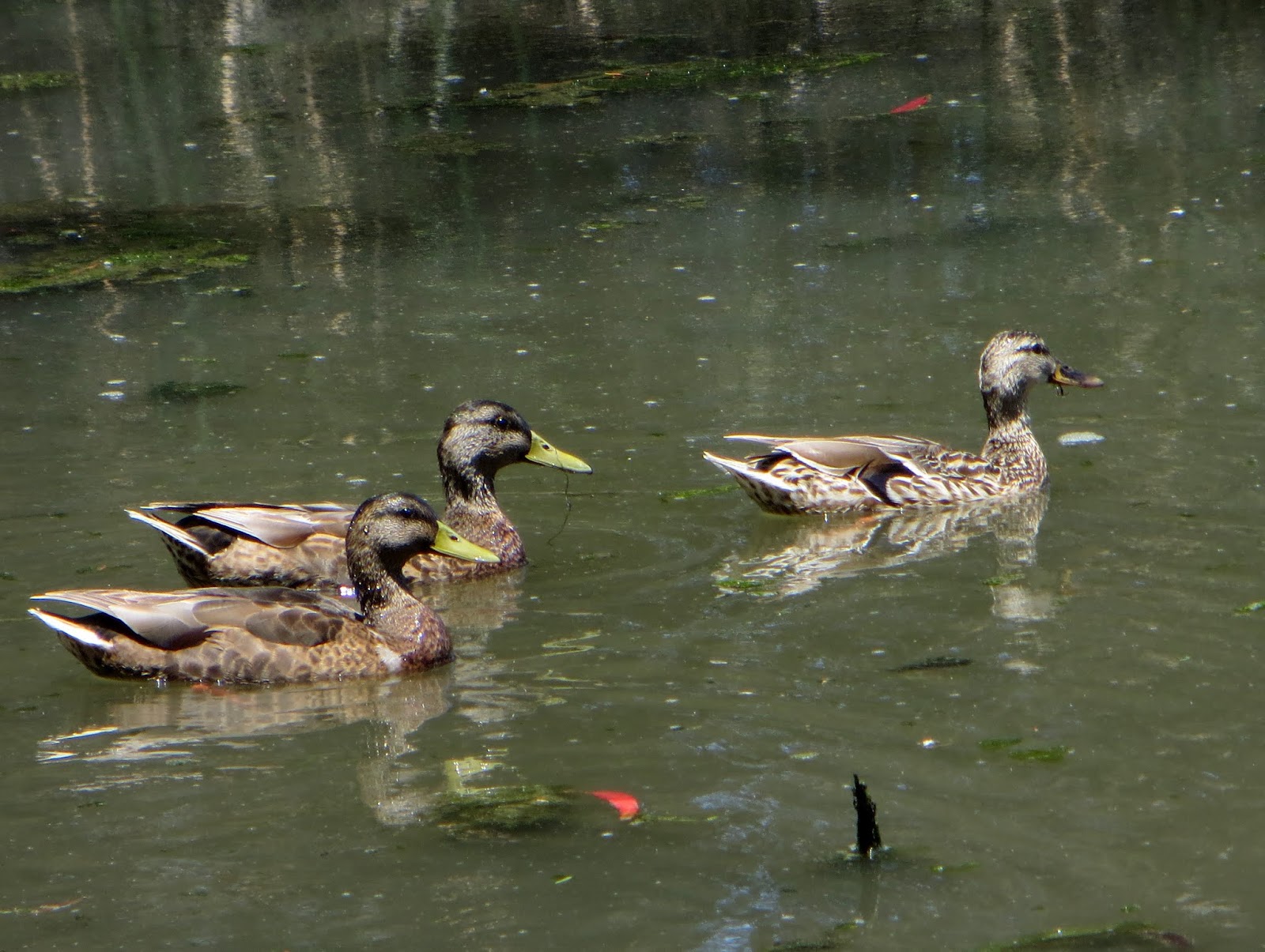There were three young Mallards swimming around together. Below are the three ducks.