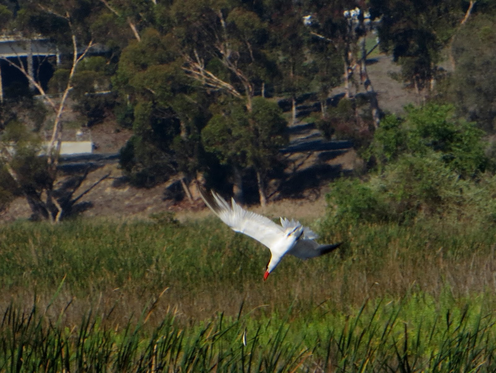 On Saturday, a juvenile Cooper's Hawk came by. It was trying to hunt, and flew from perch to perch trying to find a way to get to a group of House Sparrows hiding in a bush. It was clearly very unexperienced, as it tried to jump into the bush and climb in after the birds. The hawk was way too big to fit into the dense bush, and so it fell out onto the ground. It tried a second time with the same result, then sat in an orange tree for a while before finally flying away. Below are three photos of the hawk. In the first, the hawk is sitting on a birdbath, in the second, it's on our roof, and in the third, it's in the orange tree (its bill is open because it was panting; it was very hot on Saturday).
