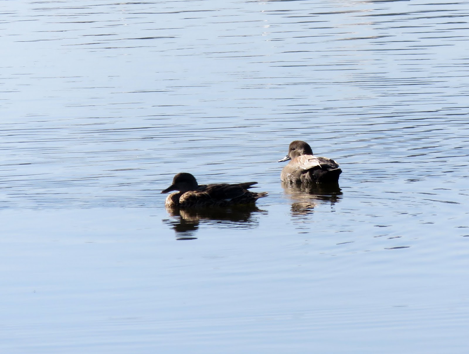 In the morning, there were a few Gadwall floating around on the lagoon. Below is a pair of them (the female is on the left, the male on the right).