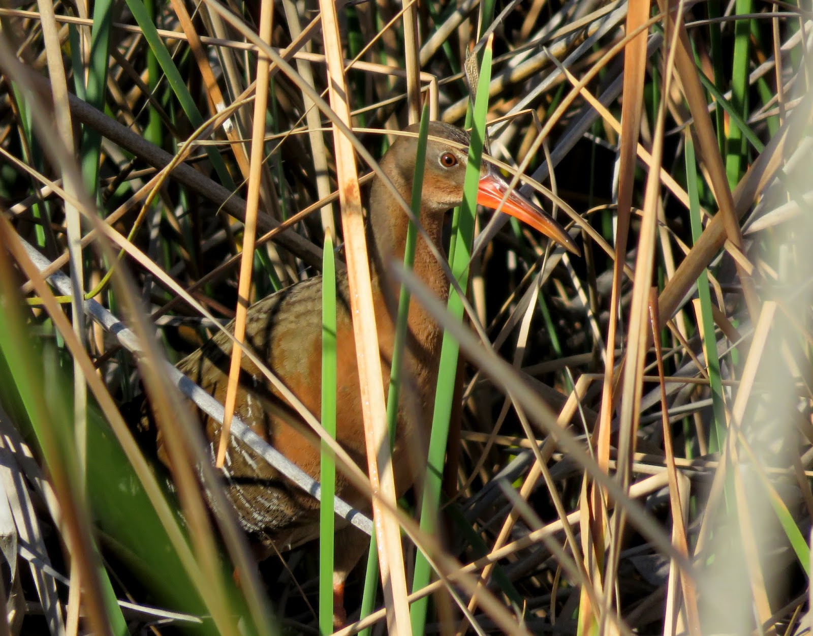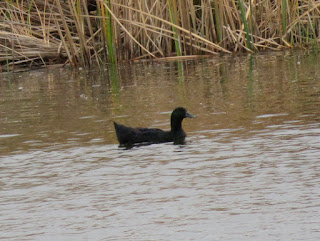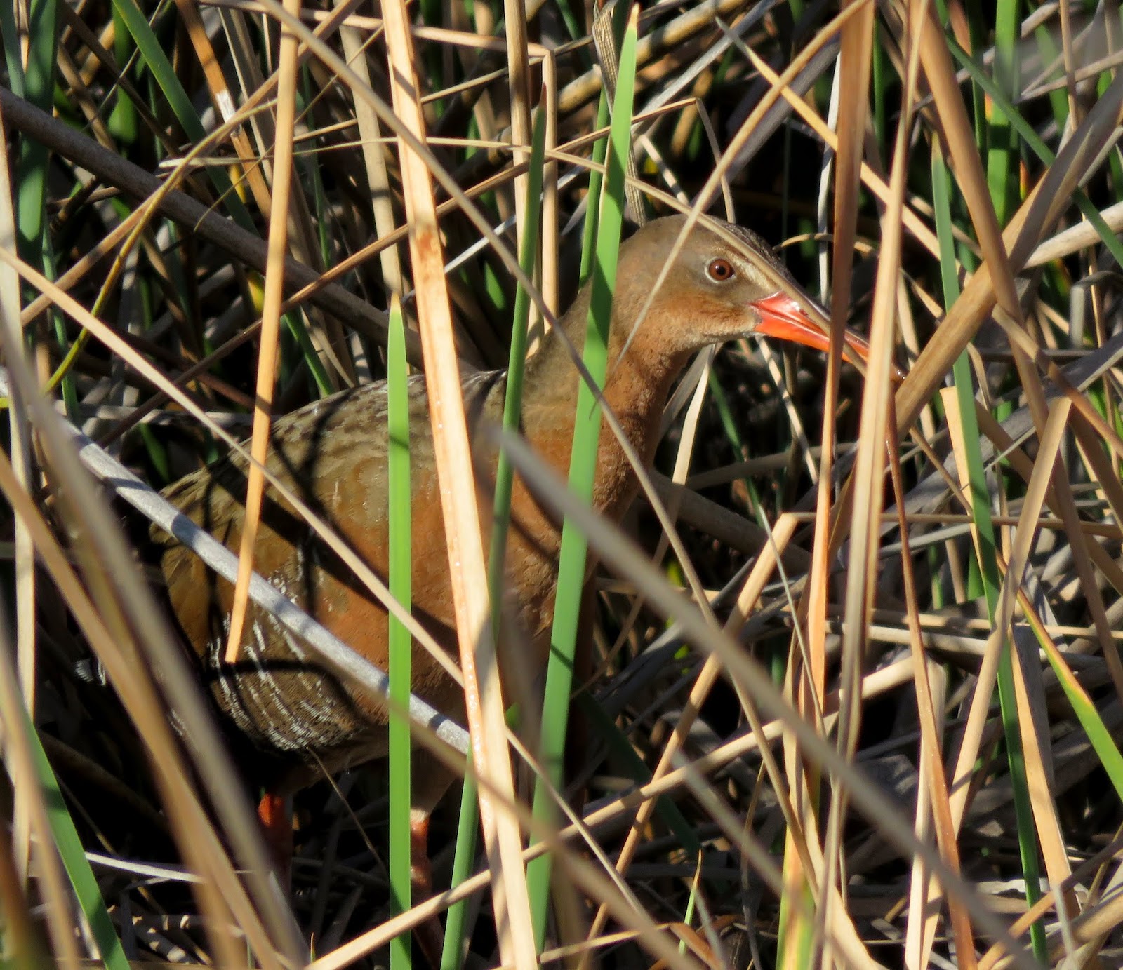 Before heading onto the trail behind the nature center, I walked along the highway to look for birds in the water and reeds beside the road. As I was walking, I was surprised by a loud clacking call close by. A Ridgway's Rail poked it's head out of the reeds. It disappeared before I could take picture, but I could hear it rustling, and occasionally it called. I walked along the road with it and eventually reached the end of the reeds. I started to make a "pst" sound to see if it might be curious and come out. It did walk out into the open and stood there looking at me. I'd never seen a Ridgway's Rail so close before; it was very exciting. Ridgway's Rails were previously considered a subspecies of the Clapper Rail, but have now been declared their own species. They live along the Pacific Coast in salt and freshwater marshes. The Ridgway's Rail is grayish-brown overall with dark streaking on the back, white streaking on the belly, a reddish-brown chest, and a white rump. It has a bright orange bill and orange legs. Below are two photos of the Ridgway's Rail.