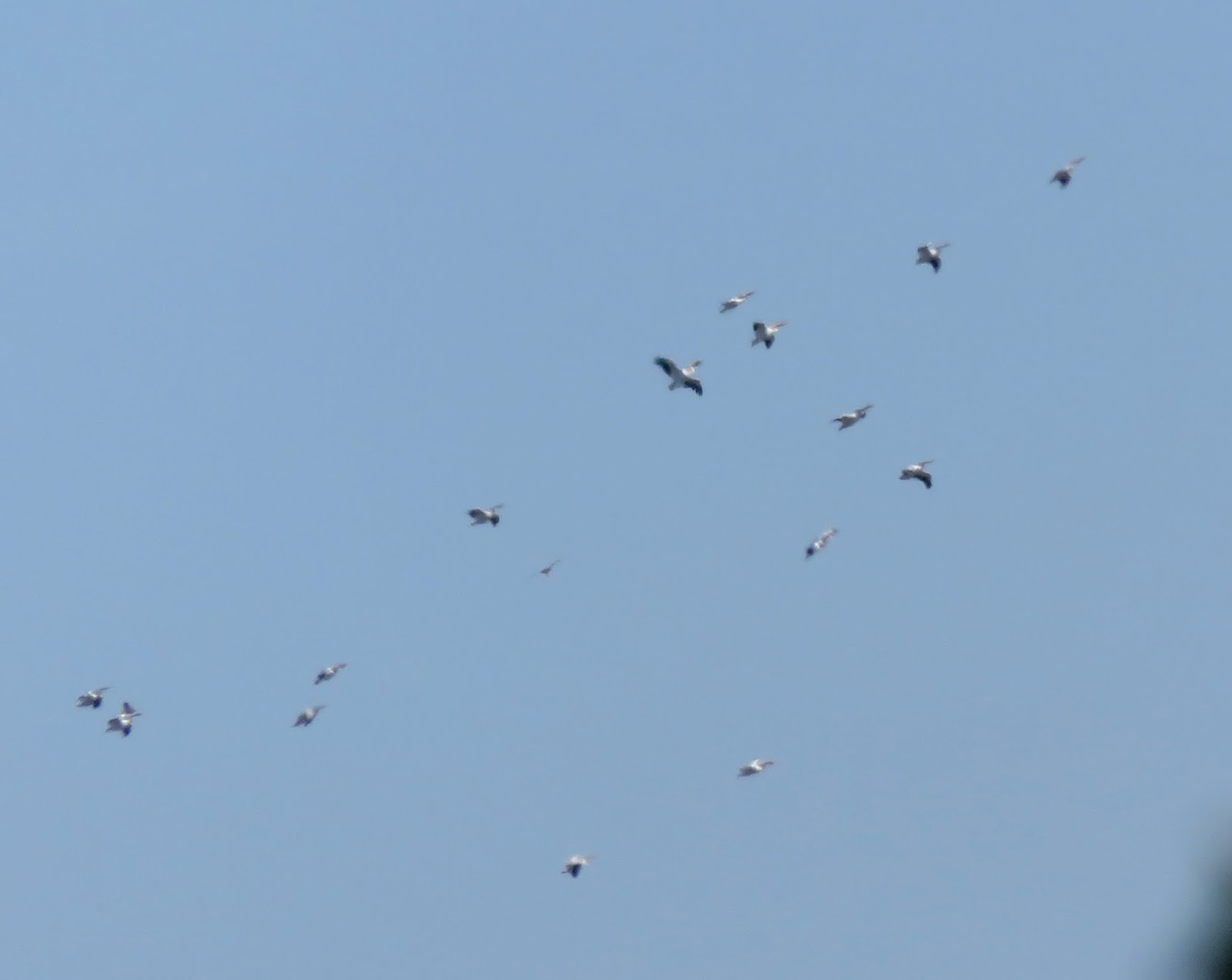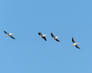We were very surprised to see a large flock of American White Pelicans. They would fly up into the air and soar around for a while before settling back down on the lagoon. I don't remember seeing so many at the lagoon before; there were at least twenty-five of them. Below are three photos of the pelicans.