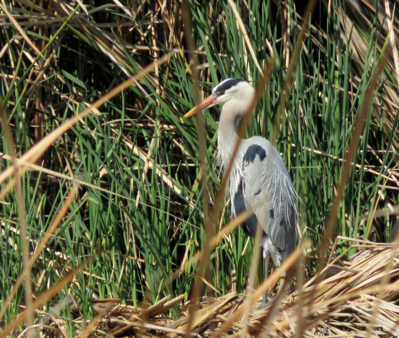 There was a Great Blue Heron sitting in the reeds, preening itself. There was one sitting in the exact same spot last month doing the exact same thing; perhaps it was the same one. Below is the heron.