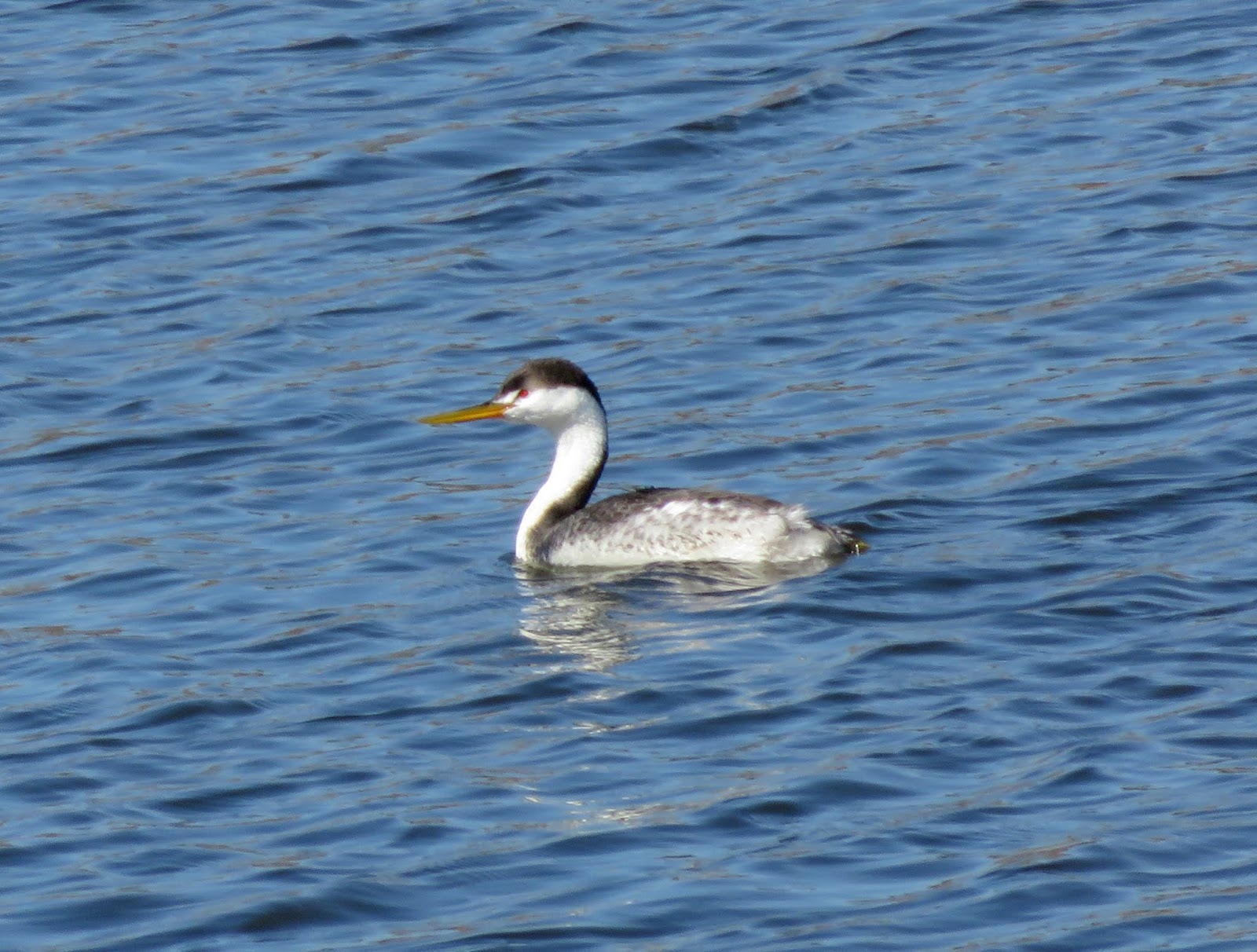 There were several Western Grebes around, but only one Clark's. Below is the Clark's Grebe (notice the black is above the eye).