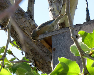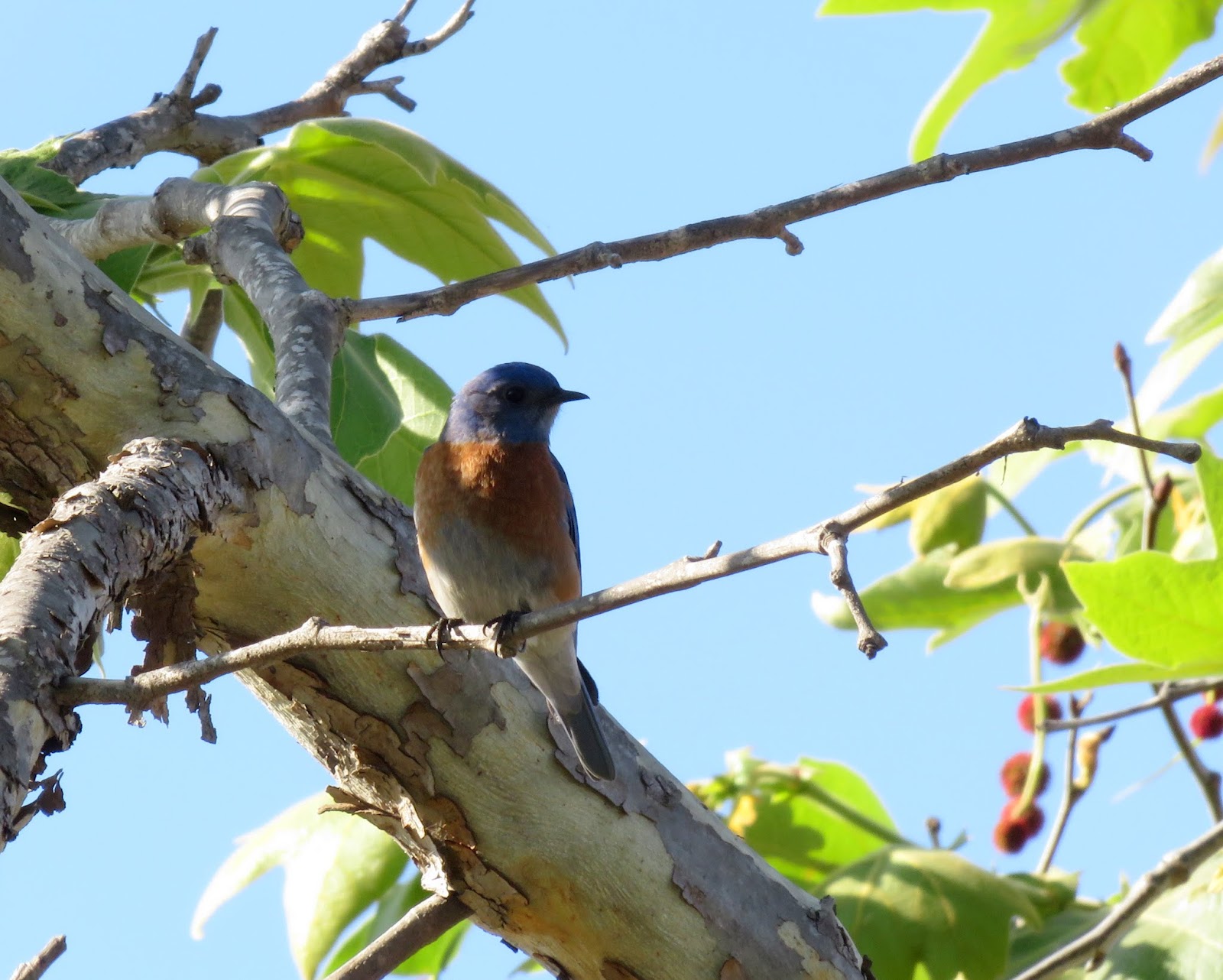 We also saw a pair of Western Bluebirds checking out the bluebird house in front of the nature center. Below are two photos. The first is of the female sitting on the birdhouse. The second is of the male sitting in another part of the tree.
